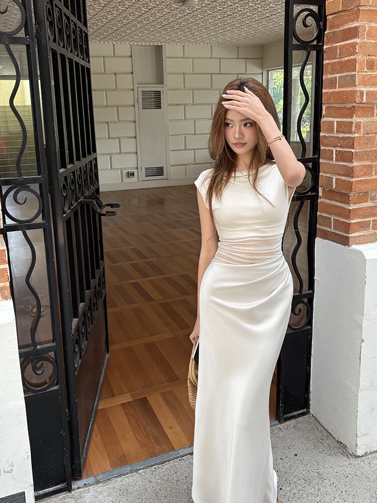 2025春夏 透かしデザイン シルエットワンンピース ノースリーブ マーーメイド丈ロング