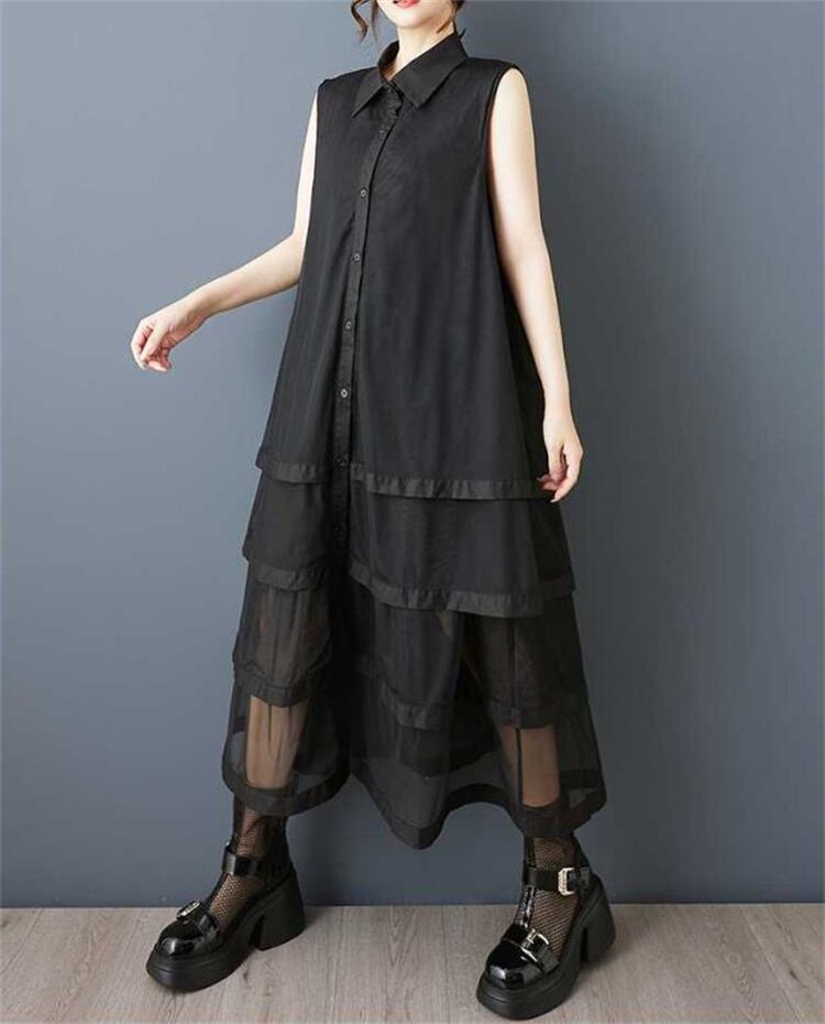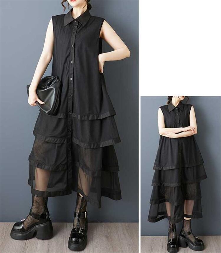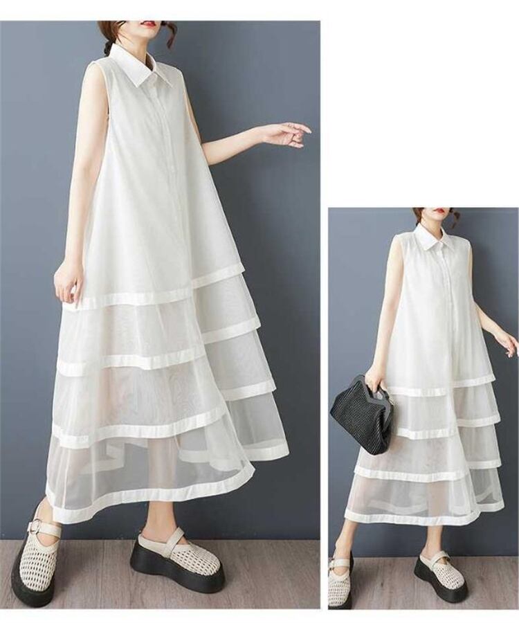 ◎【送料無料】夏物 大きいサイズ 無袖ワンピース ゆったり仕立て ネットレース継ぎ レイヤードスカート