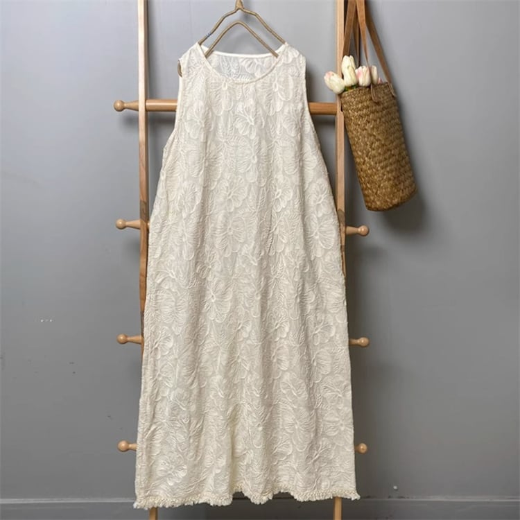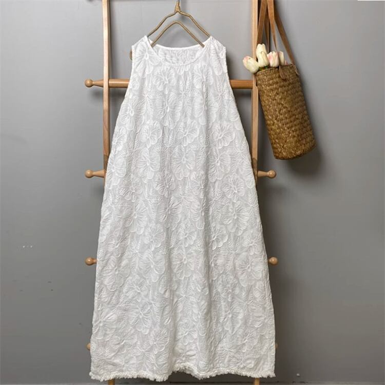夏の定番 刺繍ノースリーブワンピース ベストスタイル ゆったりロング丈 丸首 無地デザイン