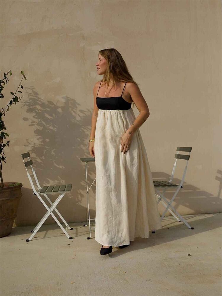 ◎【送料無料】コントラストカラー 麻系生地 ロングワンピース ノースリーブ ビーチウェア