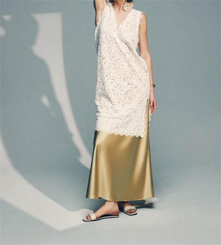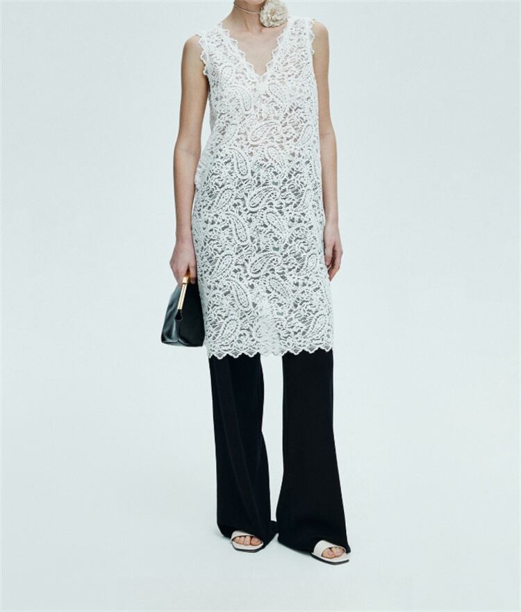 新作夏ワンピース 立体レース・袖なしVネック・腿見えスリット