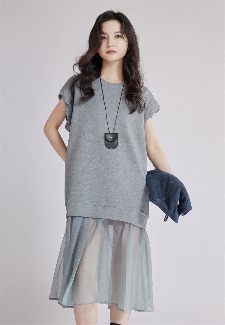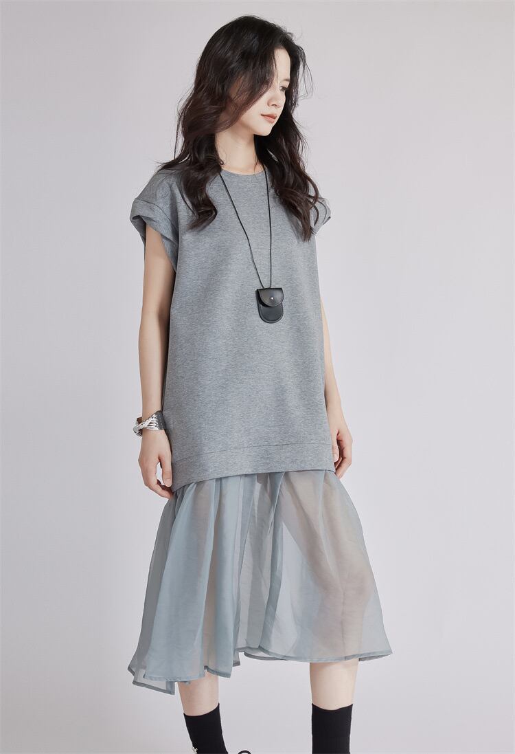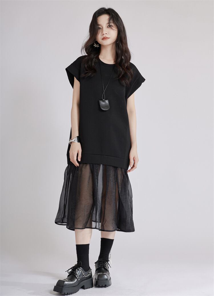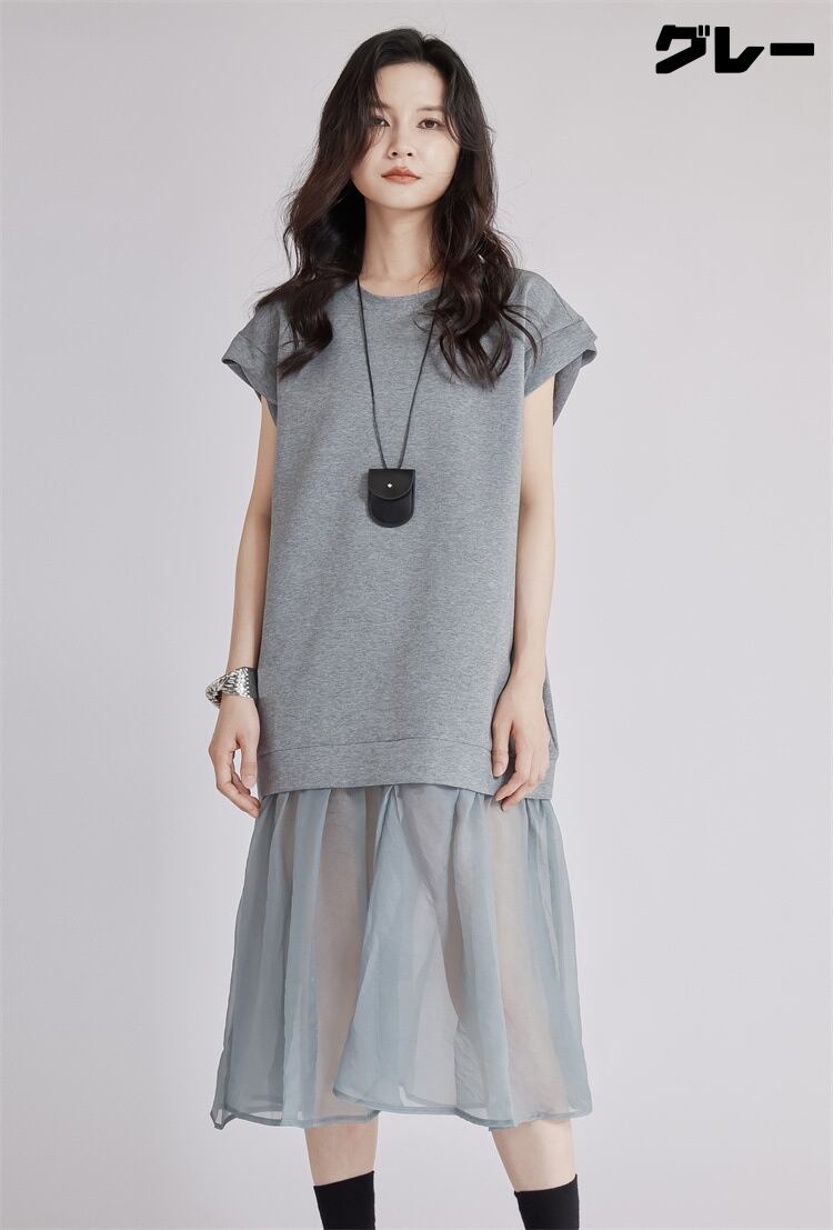◎【送料無料】半袖丸首ワンピース メッシュアクセント フェイクツーピース ミドル丈 夏季定番