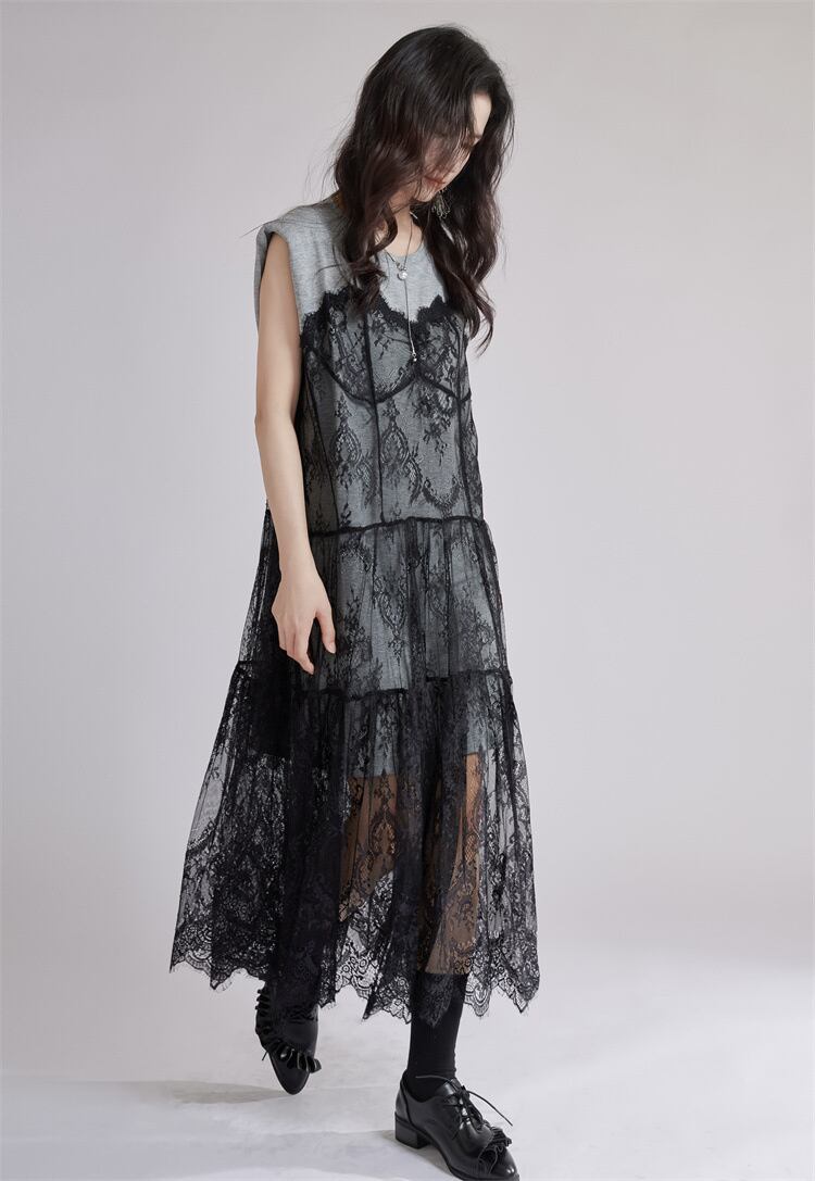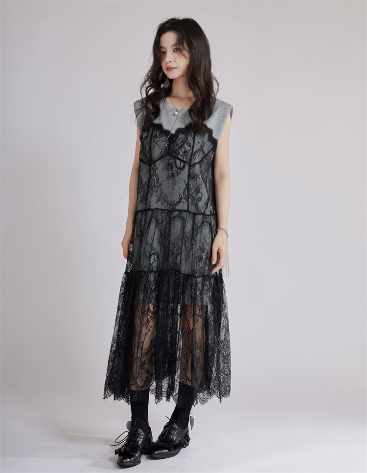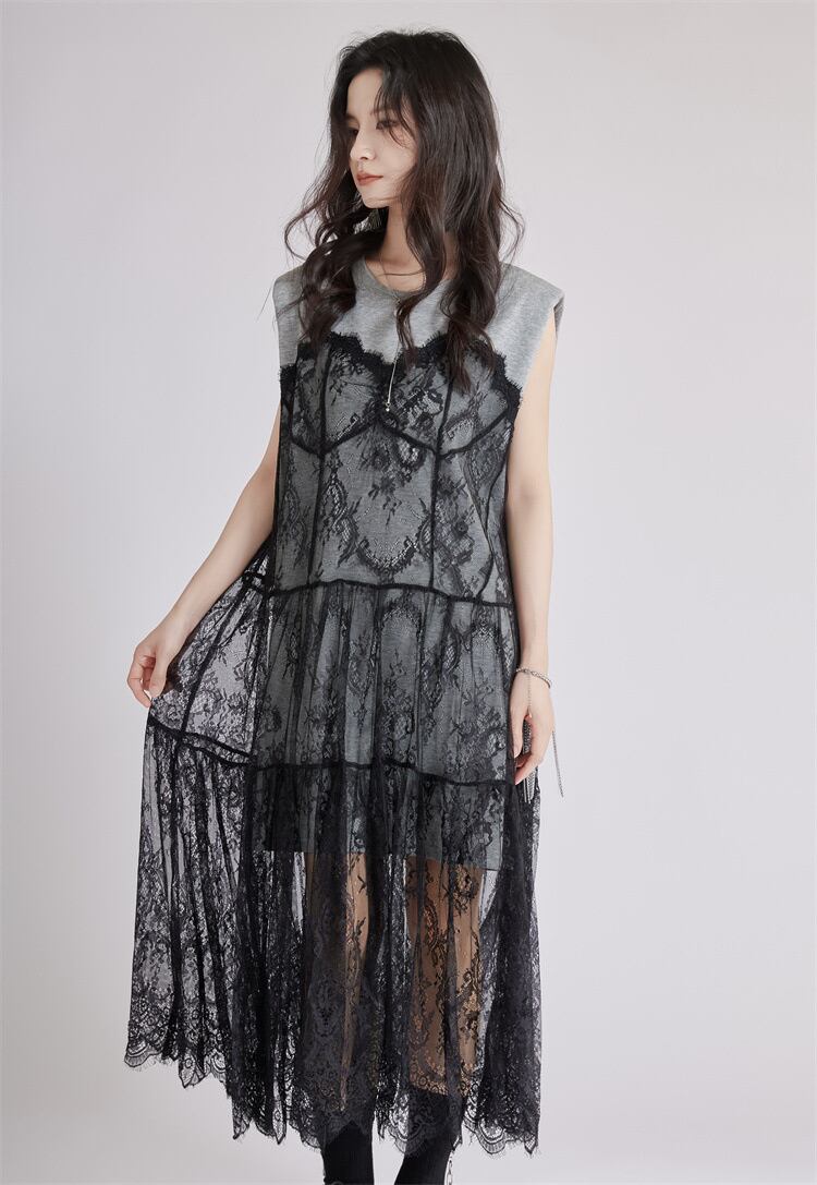 ◎【送料無料】ゆったりウエスト レースネットワンピース ロング丈 シルエット美 疑似ツーピース ベルト付き 2025夏