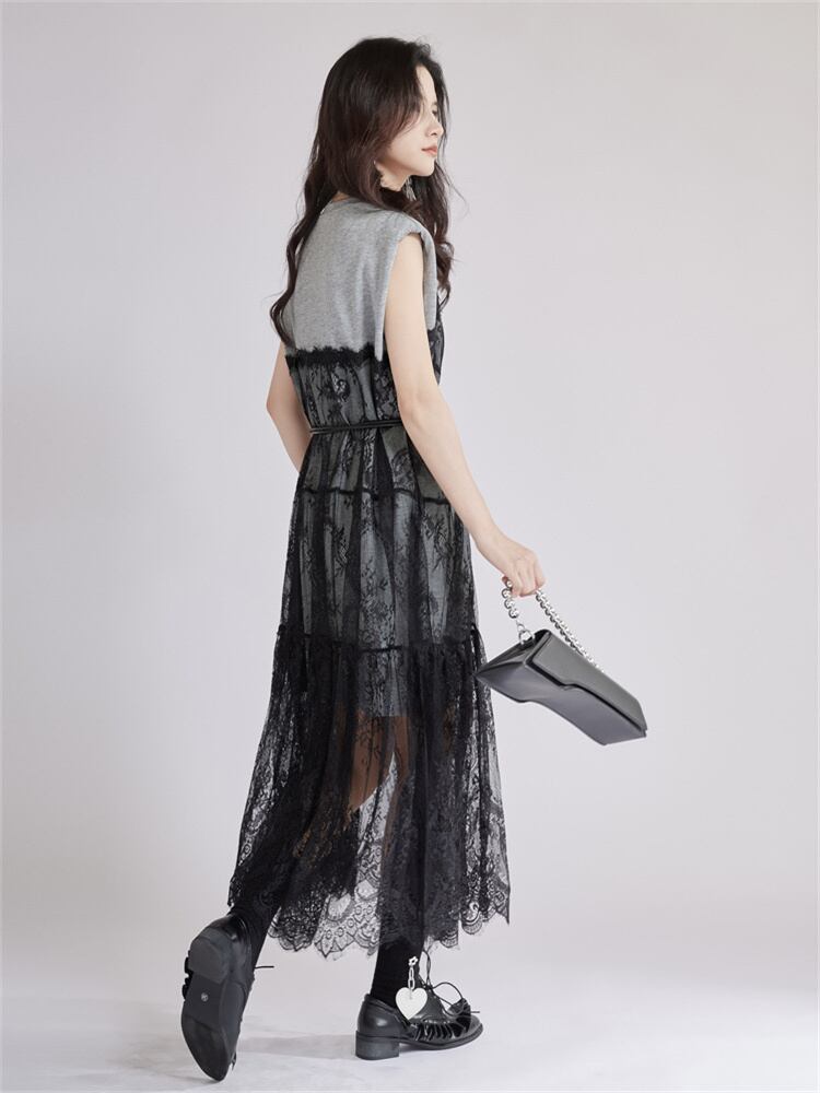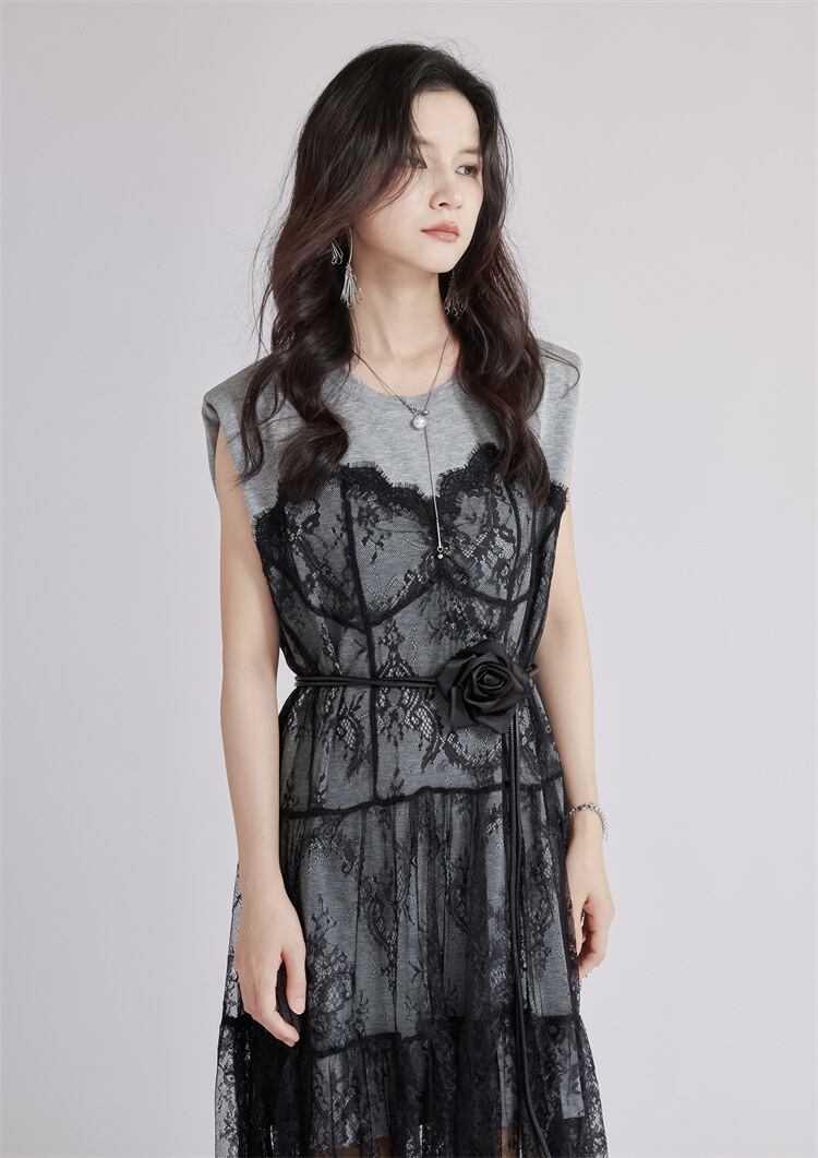 ゆったりウエスト レースネットワンピース ロング丈 シルエット美 疑似ツーピース ベルト付き 2025夏