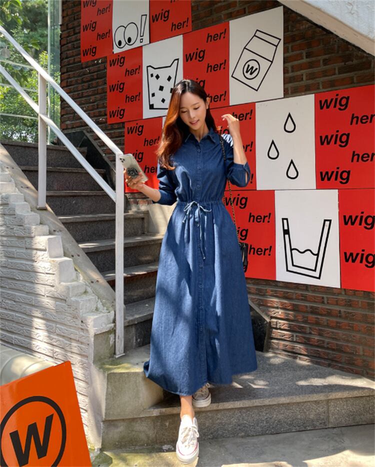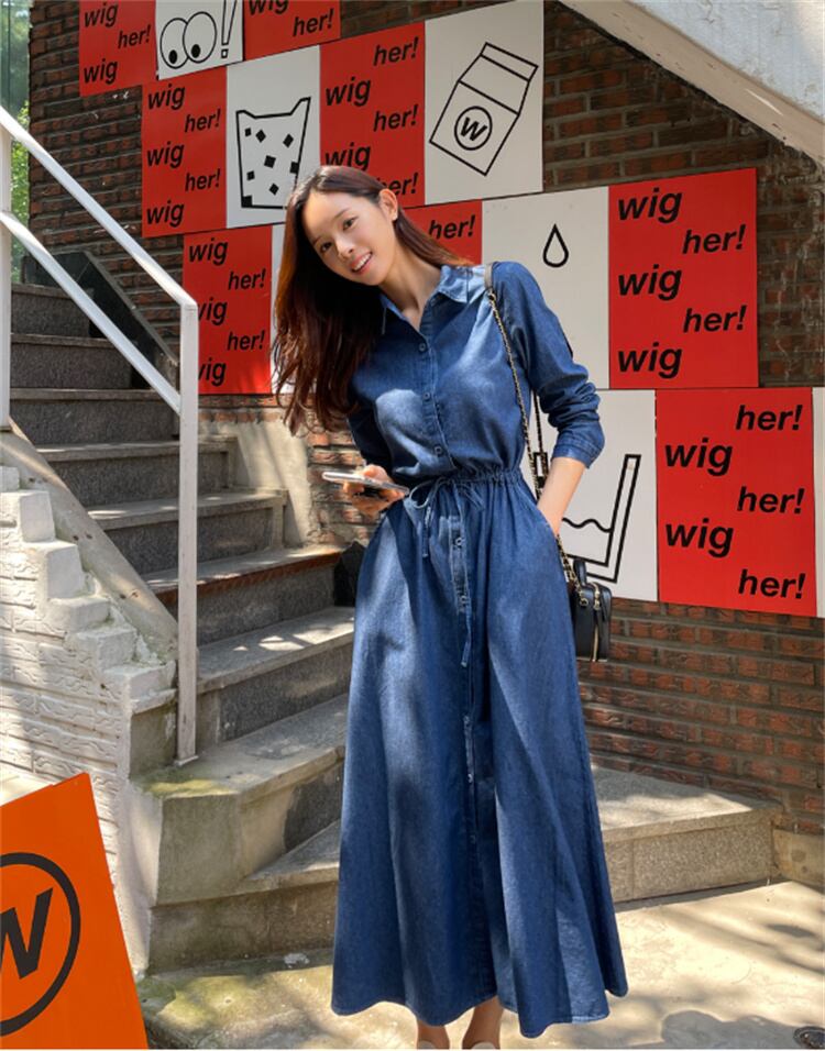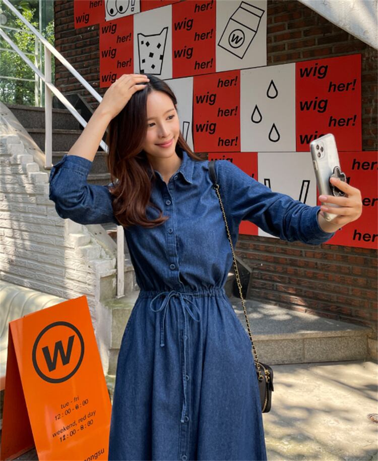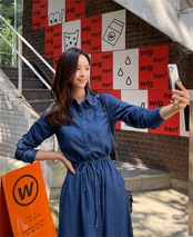 レトロ調 ゆったりデニムワンピース 長袖シャツ型 結び紐