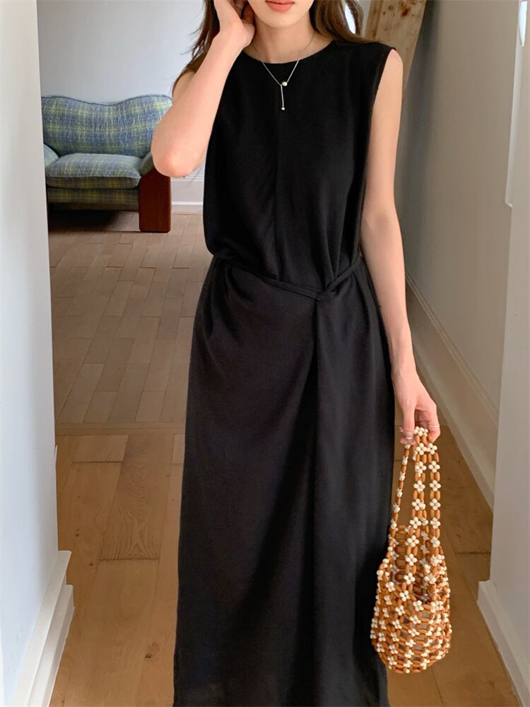 ◎【送料無料】ウエストフィット 丸襟 ノースリーブ ロングワンピース 2025年夏 気品