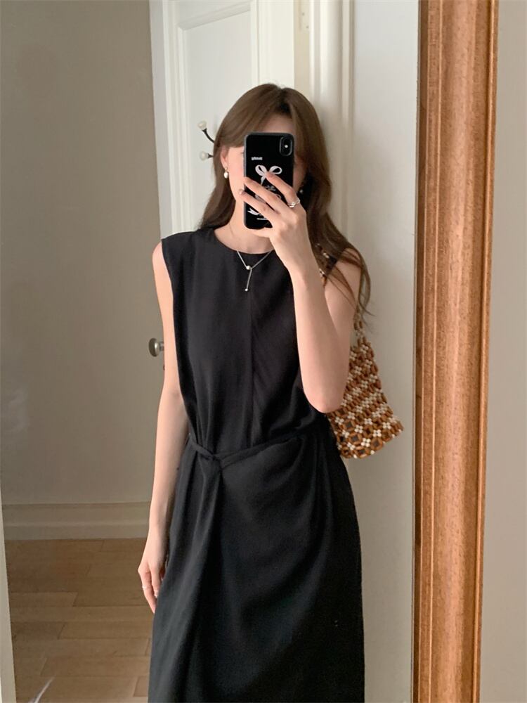 ウエストフィット 丸襟 ノースリーブ ロングワンピース 2025年夏 気品