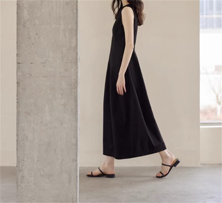 【ロング丈】クルーネック シンプルノースリーブワンピース 夏用