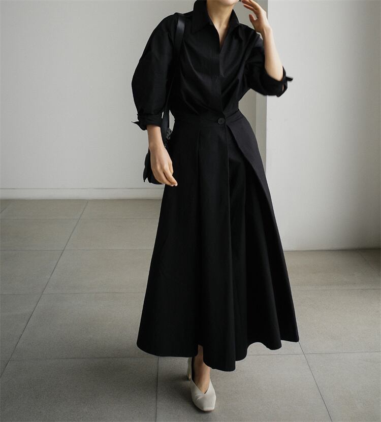 肌触り抜群のリネン風素材で、上品さと快適さを両立; ハイウエスト×ロング丈が足長効果をサポート! シャツカラーの程よいフォーマル感で、ちょっとしたパーティーや結婚式の2次会にもぴったり; 洗える素材なのでお手入れラクラク; 涼しげなカラー展開で、夏の暑さもエレガントに乗り切りましょう〜∽注意事項∽