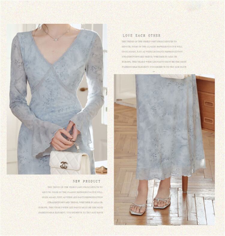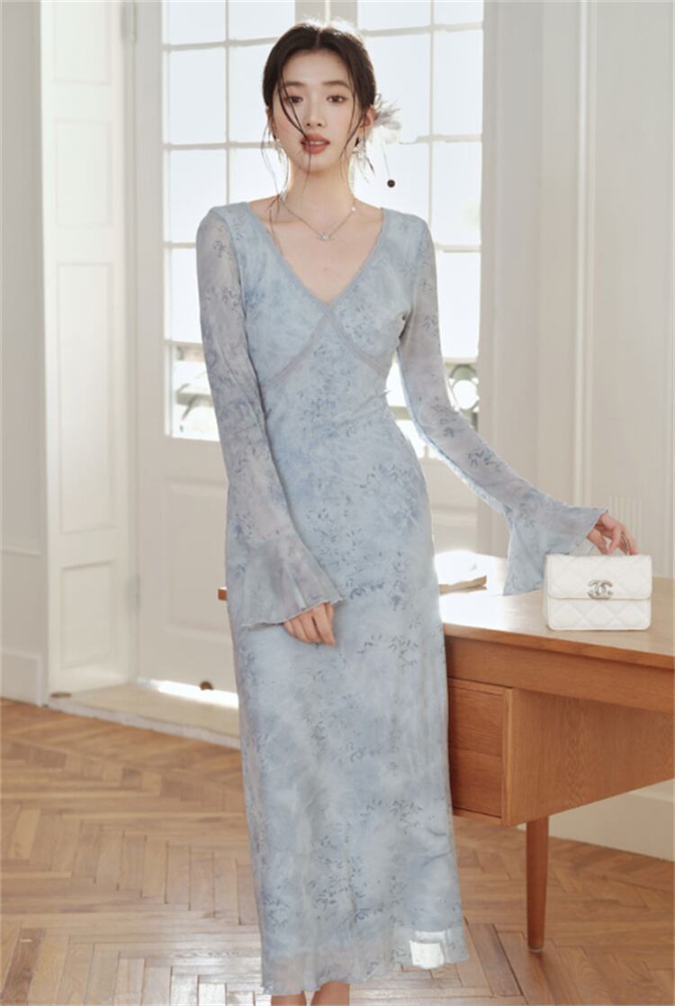 ◎【送料無料】蝶プリント Vカラー フレア袖 伸縮ウエスト ネットワンピース 2025春季 ロング丈