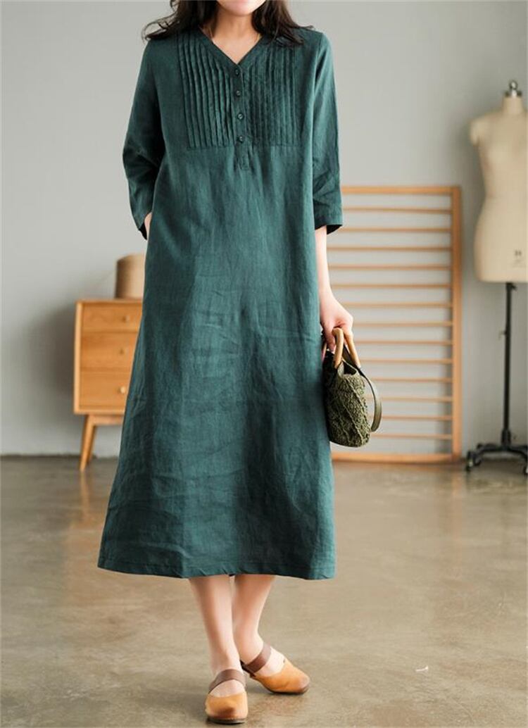 ボヘミアンリネンワンピース 2025春夏 五分袖Vネック 薄手ロング丈 大人カジュアル エレガント