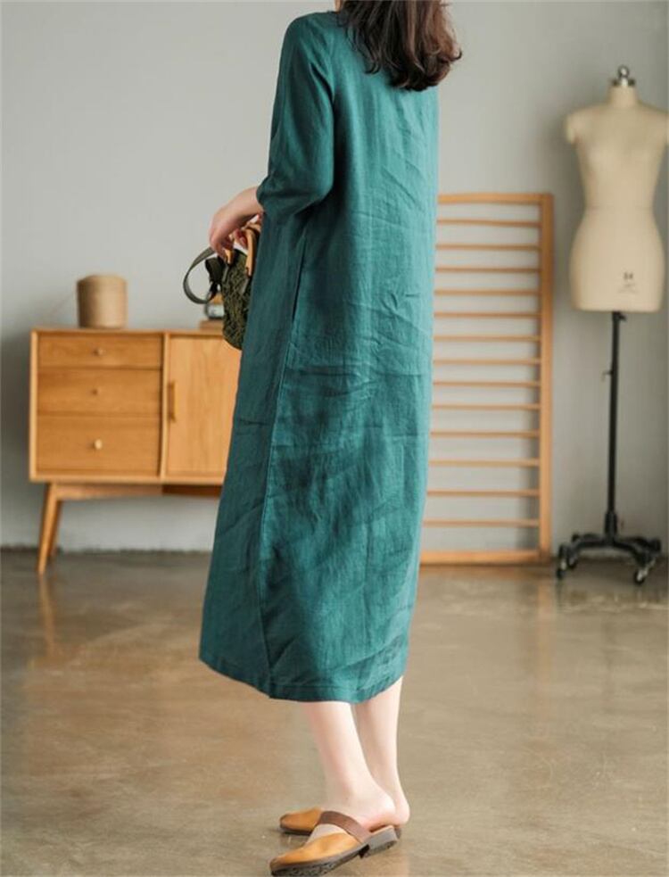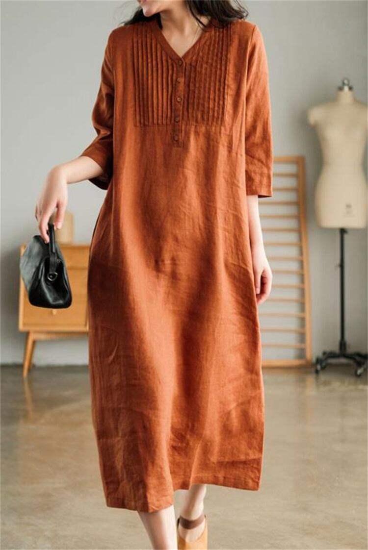 ◎【送料無料】ボヘミアンリネンワンピース 2025春夏 五分袖Vネック 薄手ロング丈 大人カジュアル エレガント