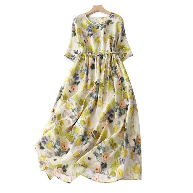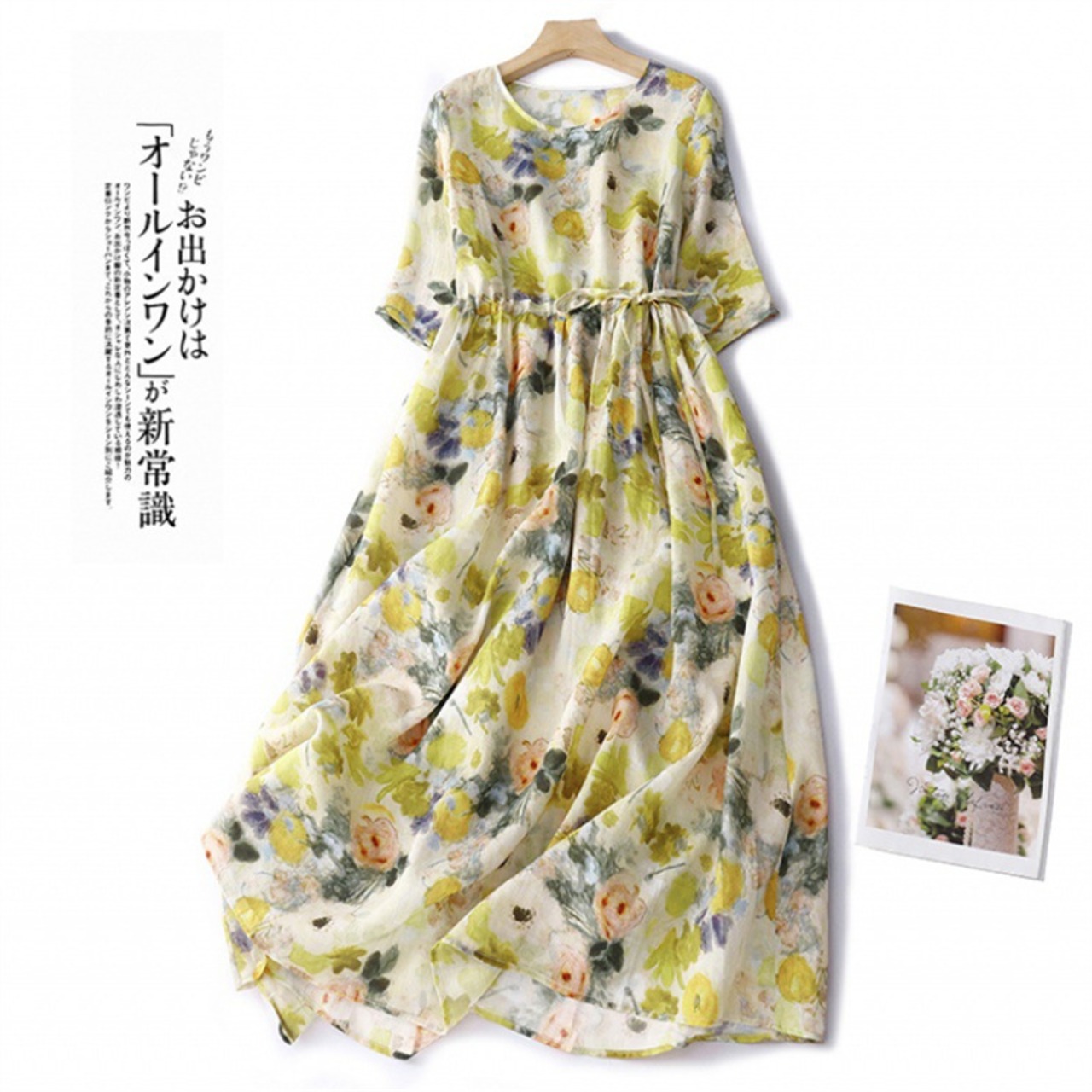 ナチュラルアートプリントの麻ワンピース ロング丈で脚長効果 レトロモダンスタイル