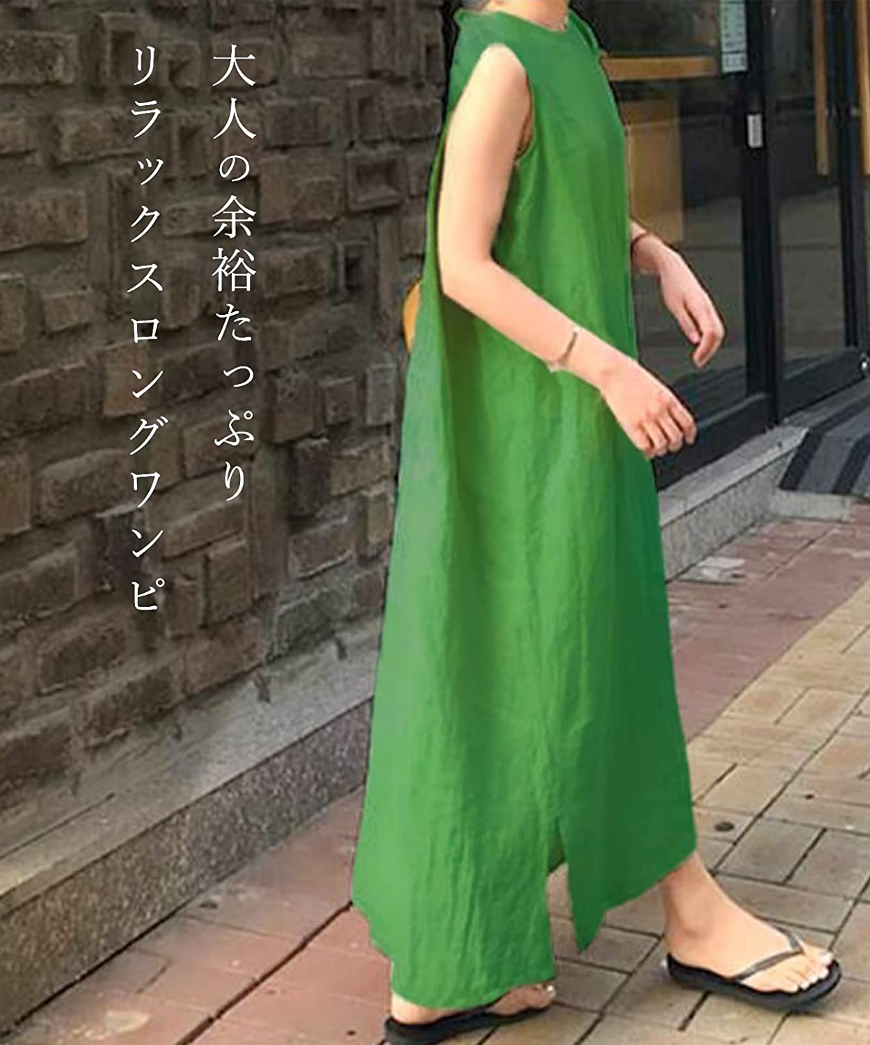 通気性の良い綿麻素材を使用したノースリーブのマキシ丈ワンピースです。