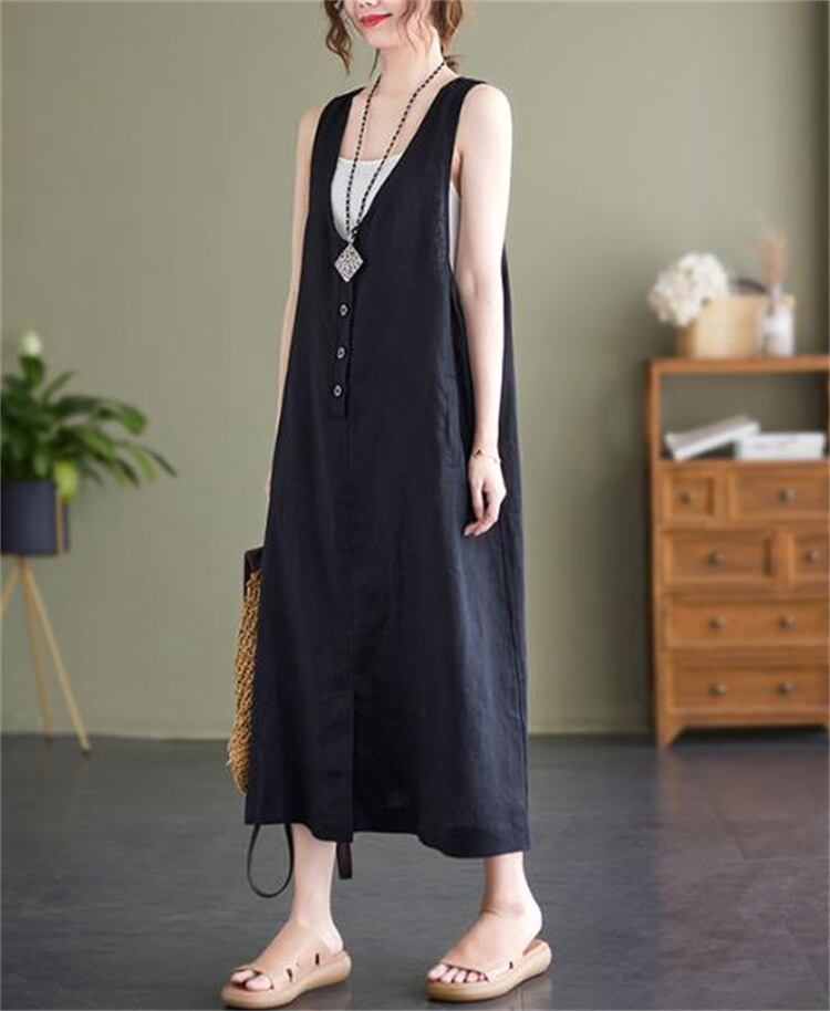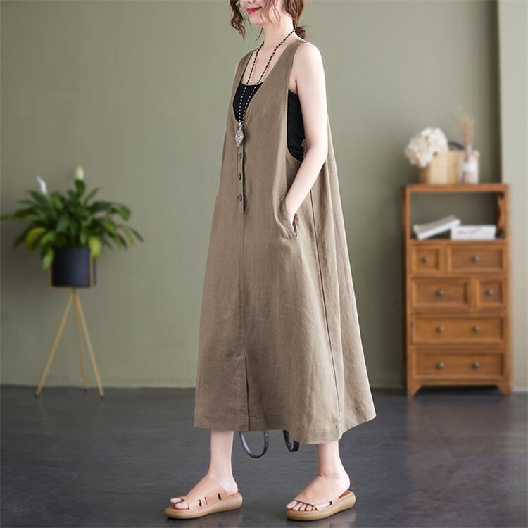 ◎【送料無料】【ヴィンテージ風】2025夏 麻混 ノースリーブワンピ オーバーサイズ ロングスカート