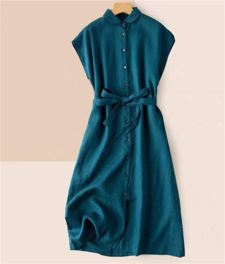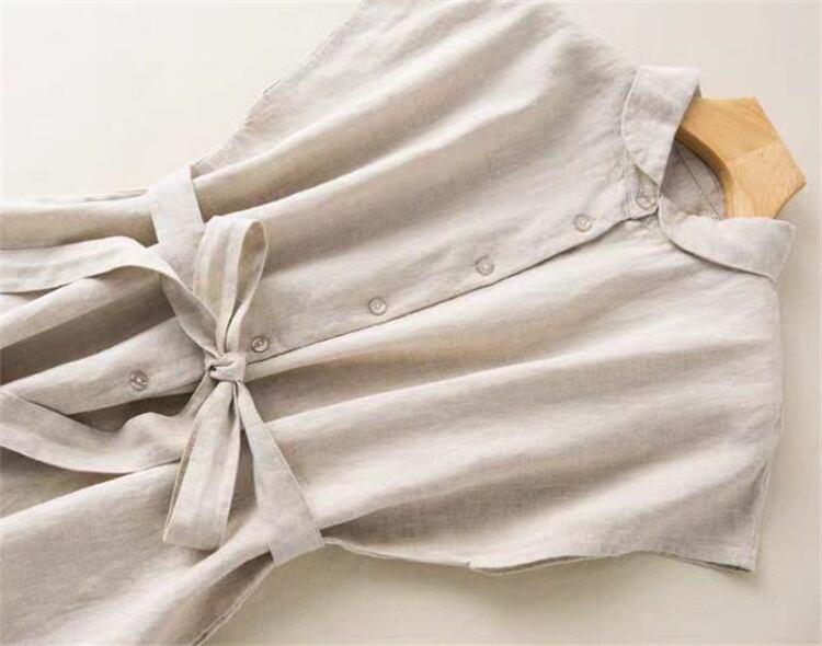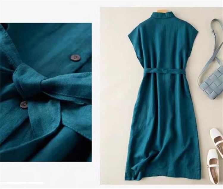 ◎【送料無料】大人カジュアル レトロ麻ノースリーブ スタンドカラーAラインワンピース 夏着心地 コットンリネン素材