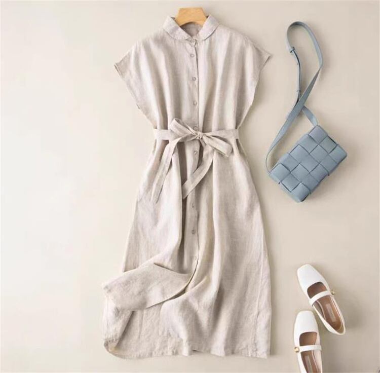 大人カジュアル レトロ麻ノースリーブ スタンドカラーAラインワンピース 夏着心地 コットンリネン素材