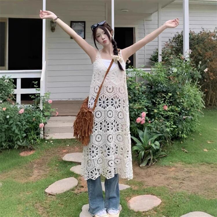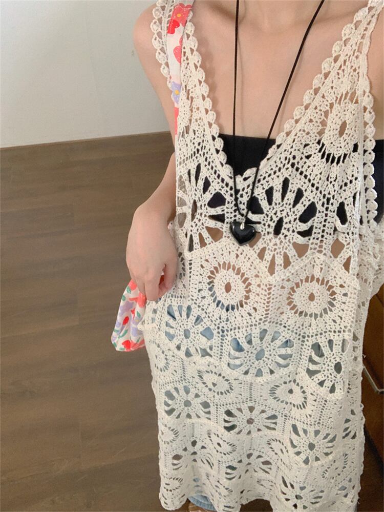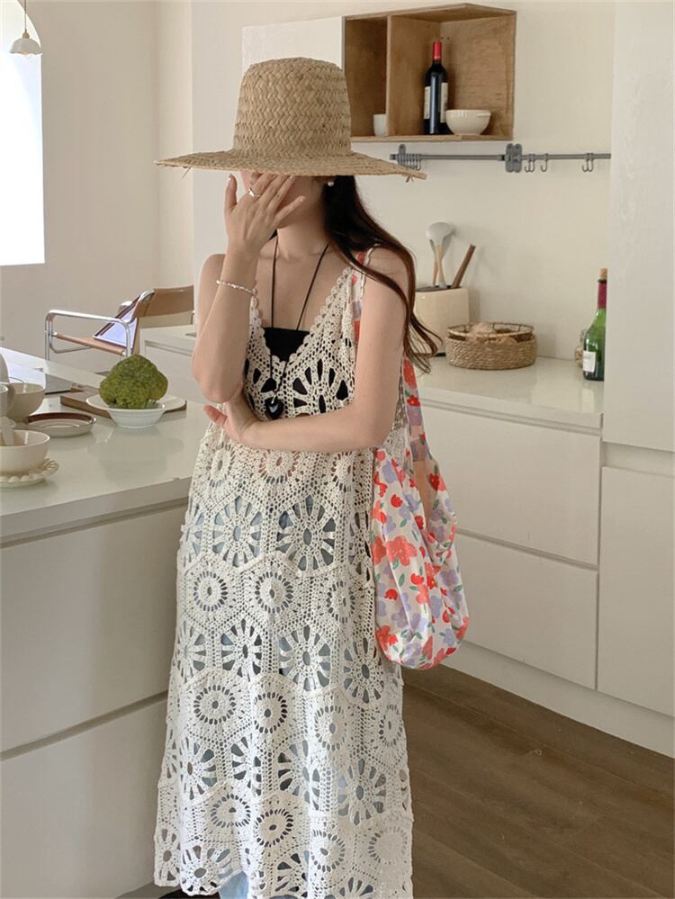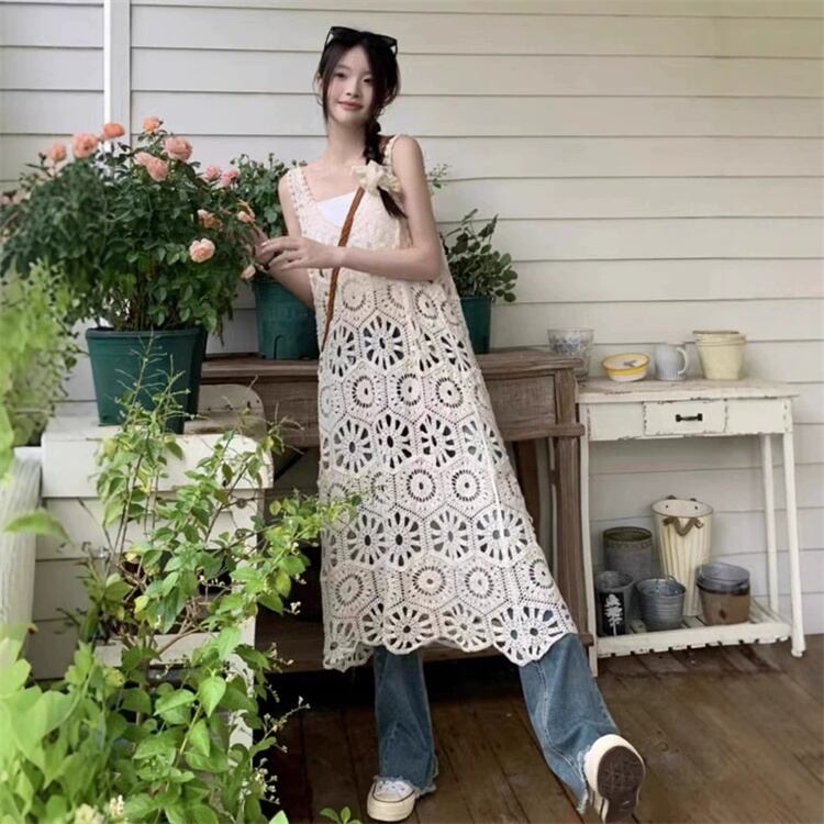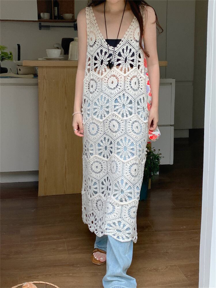 繊細なフックレースとレース編みが上品なVネックのノースリーブワンピース。ロング丈のシルエットがスタイルをすっきり伸ばし、透かし編みの素材で涼やかな着心地です。レトロな雰囲気の中に現代的なデザイン感をプラス◎オフィスやデートに差をつける一枚です。