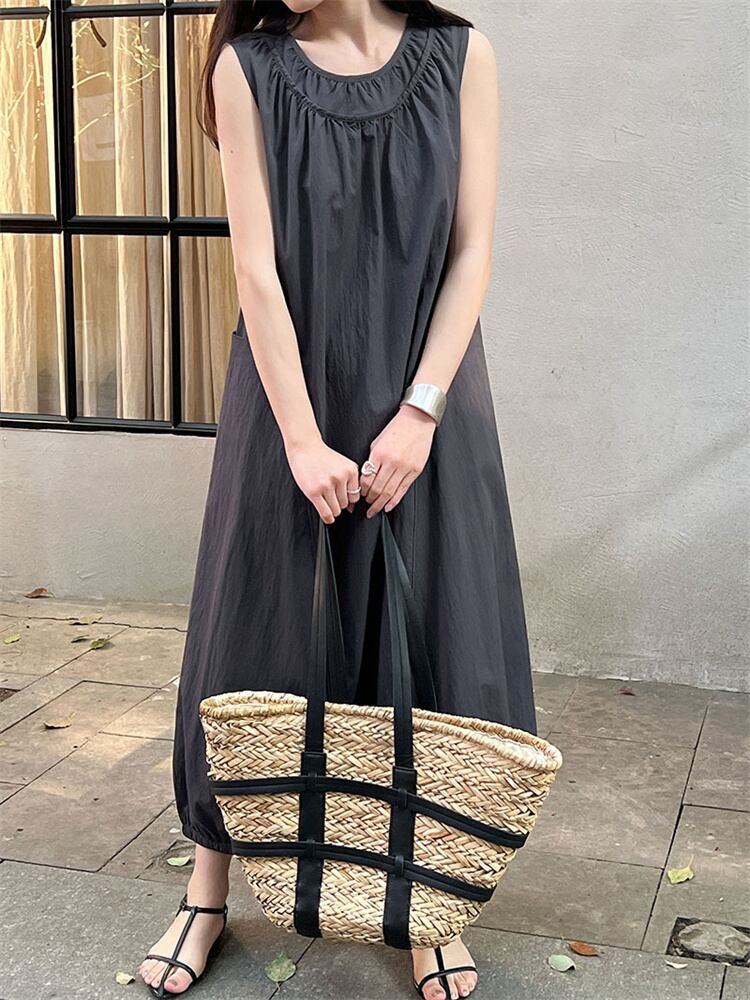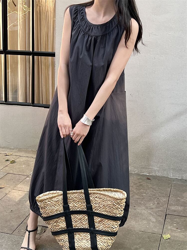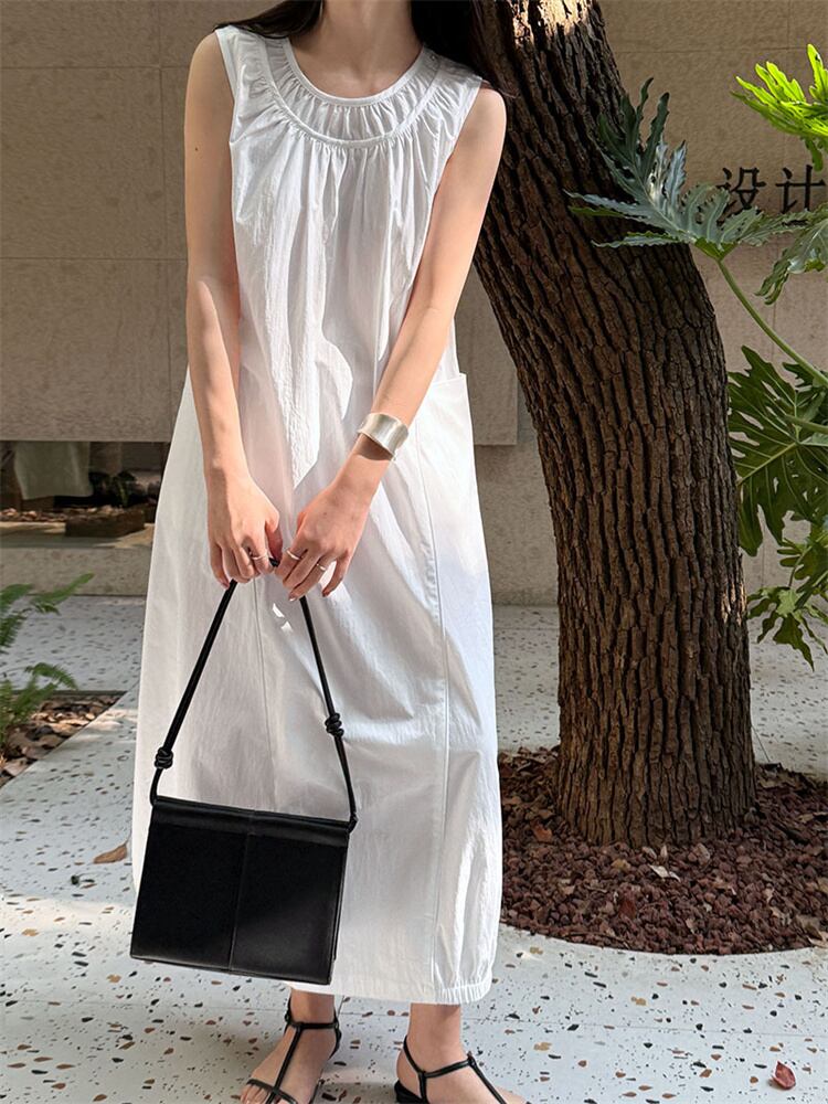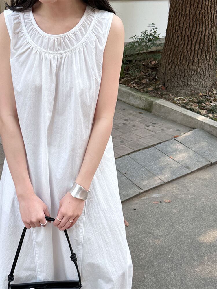 2025春 ミニマルデザイン ベーシックワンピース ダブルネックライン+プリーツディテール