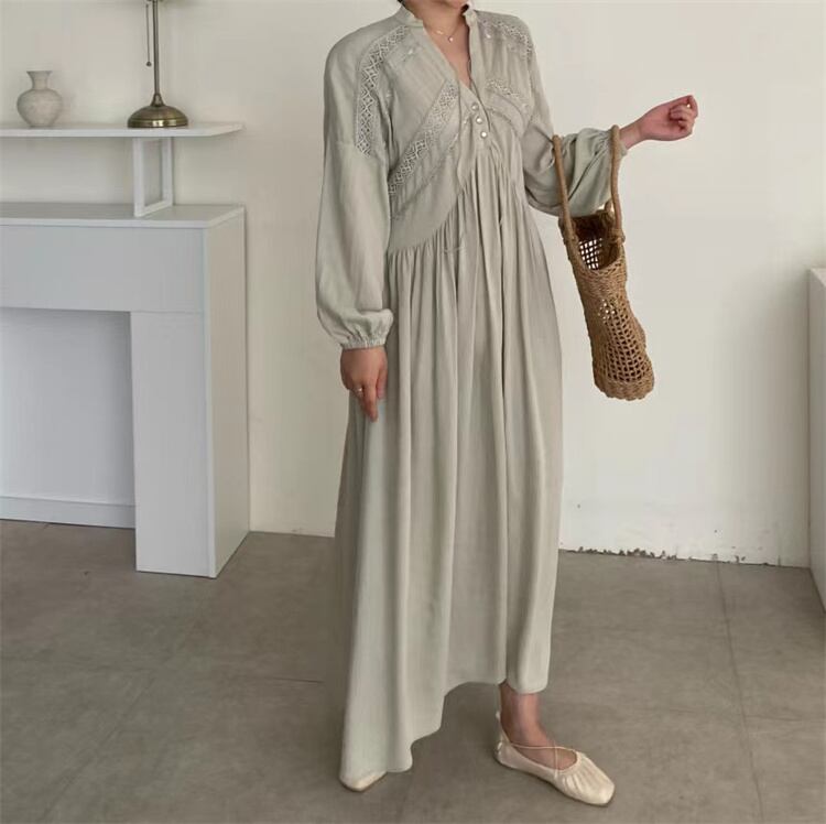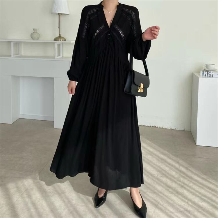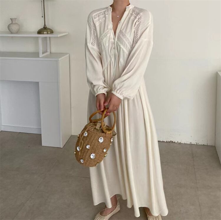 ◎【送料無料】独特の存在感 レトロモダン ロングワンピース 長袖 レースフリル刺繍拼接 大人気エレガントドレス