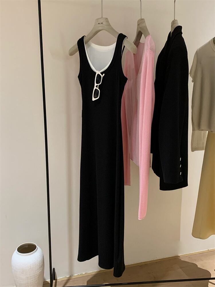 ◎【送料無料】楽しておしゃれ ノースリーブニットワンピース コントラストカラー×ロング丈 大人カジュアル夏物