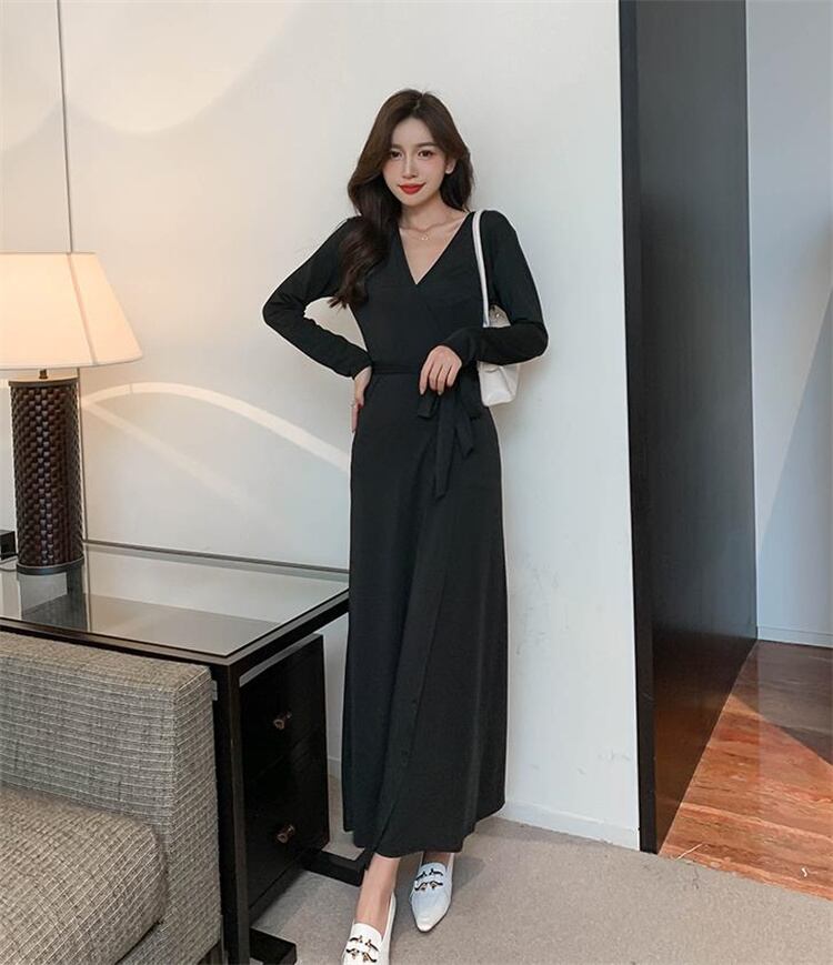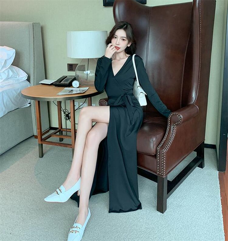 ◎【送料無料】受け取って腰 セクシー スリム 気質 スプリット 長袖 ワンピース 夏 ロングスカート Vネック