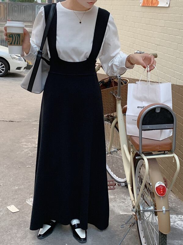 ◎【送料無料】長袖シャツ サスペンダースカート サロペットスカート 体型カバー ロング 韓国風 レディース