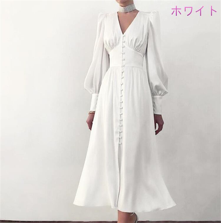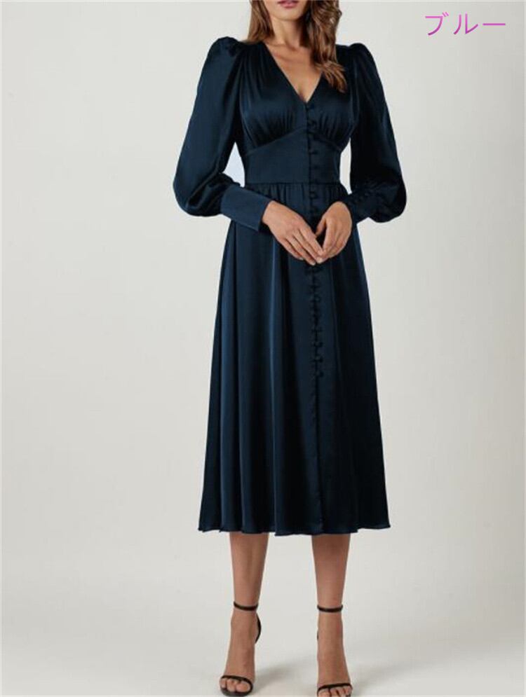 ワンピース デザインセンス ピュアカラー 気質 Aライン ランタンスリーブ 受け取って腰 ロングスカート
