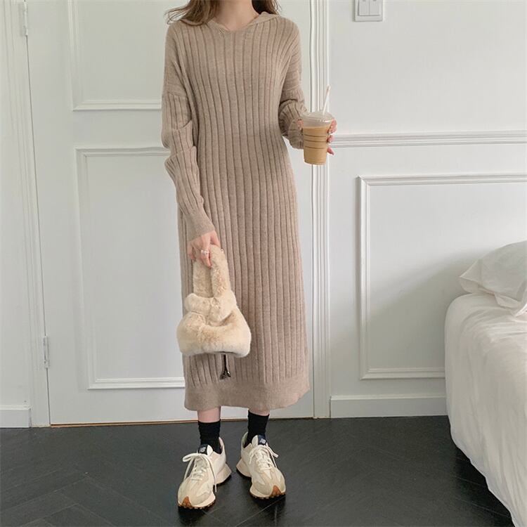 フード付き 気質 怠惰な風 スリム Vネック ロングスカート ニットワンピース