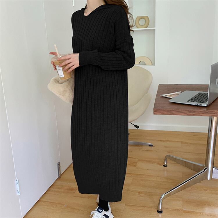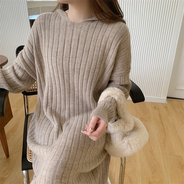 ◎【送料無料】魅力を醸し出す フード付き 気質 怠惰な風 スリム Vネック ロングスカート ニットワンピース