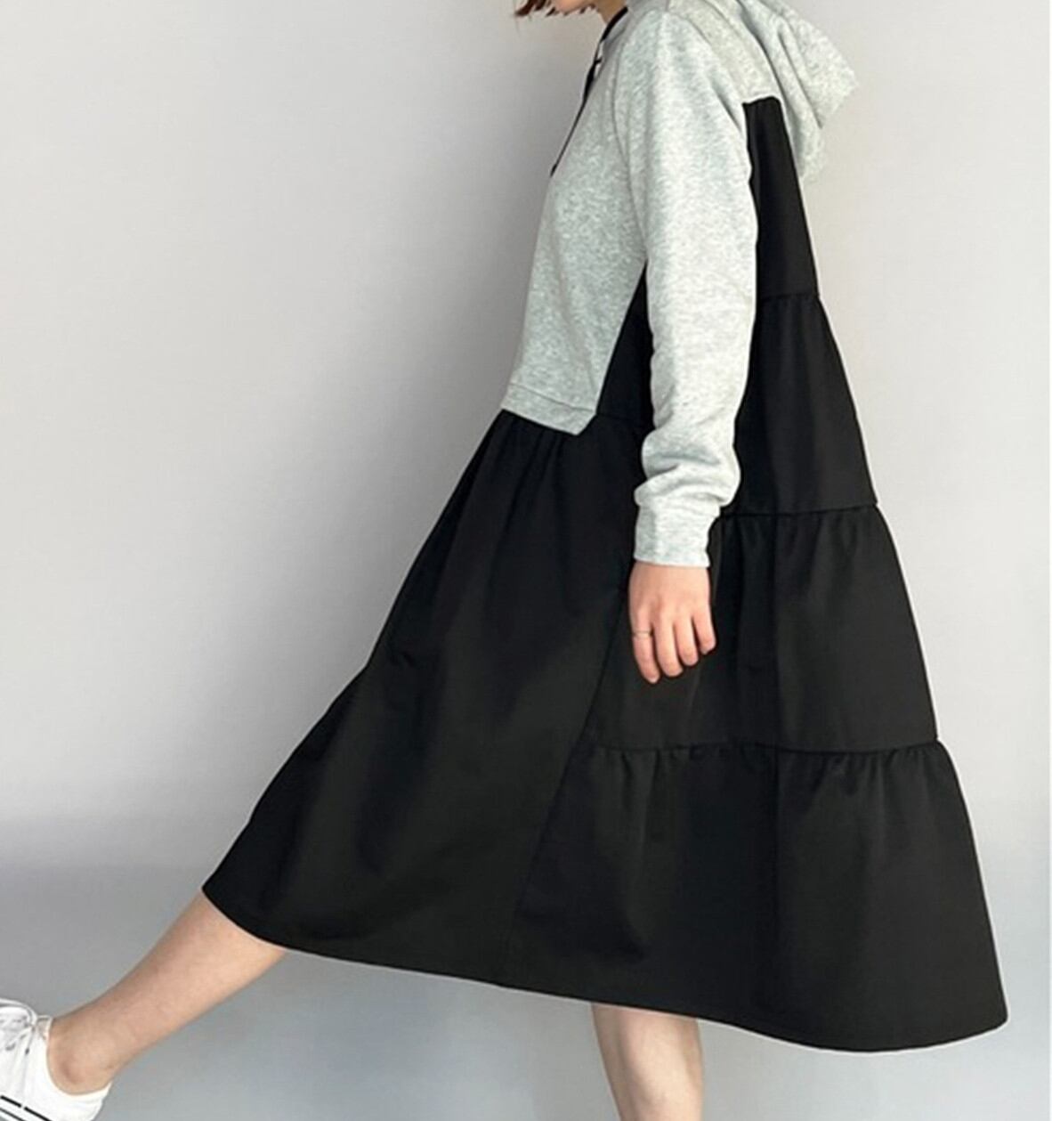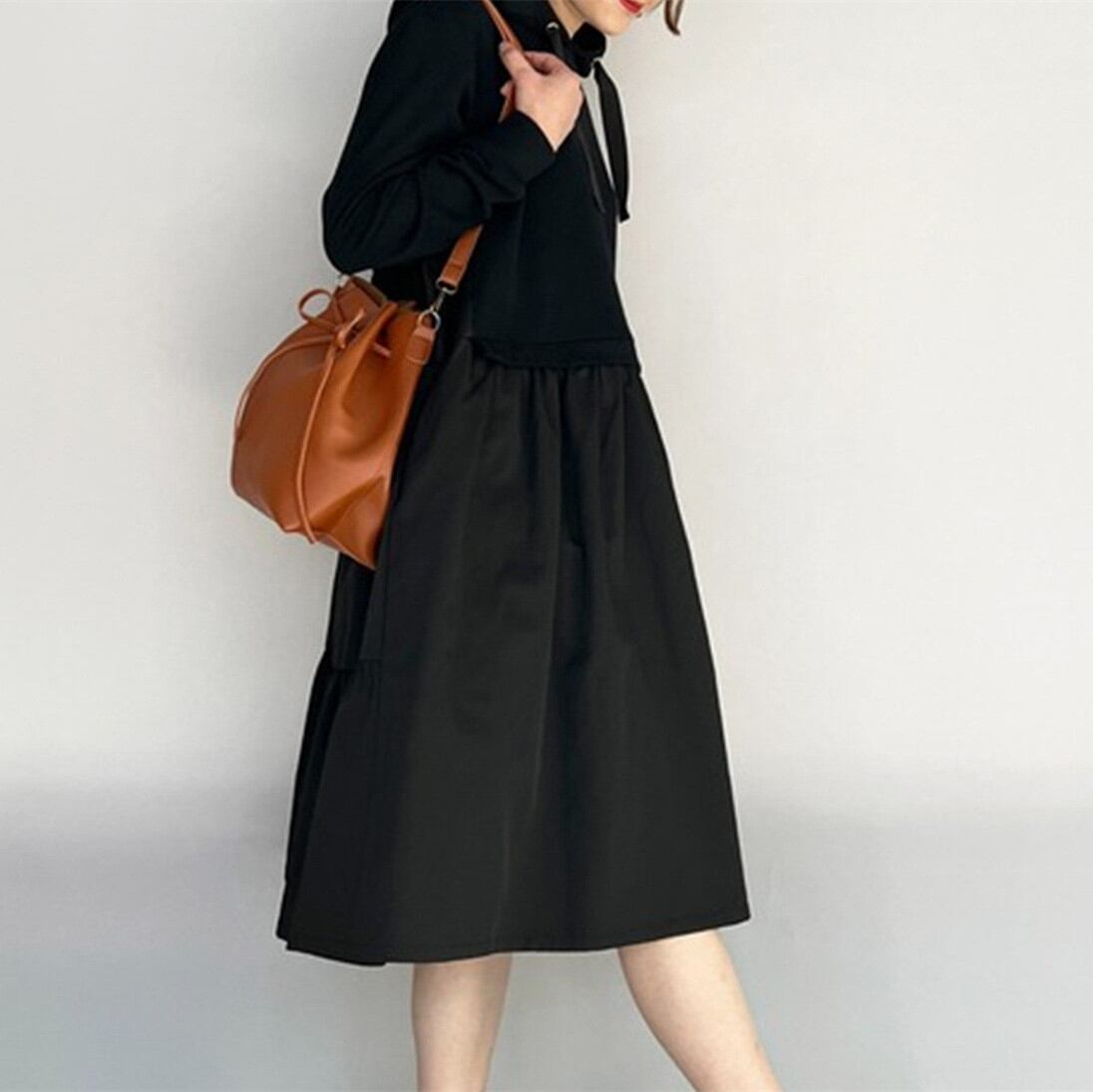 ◎【送料無料】2022秋新作 異素材 ワンピース フード付き 体型カバー カジュアル おしゃれ 着回し レディース