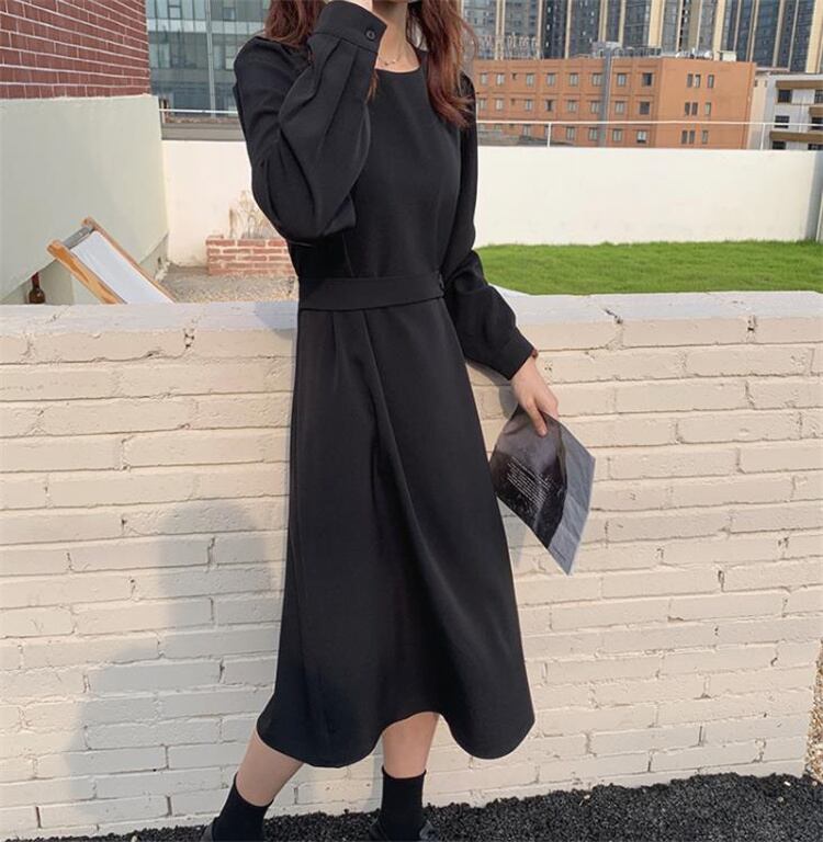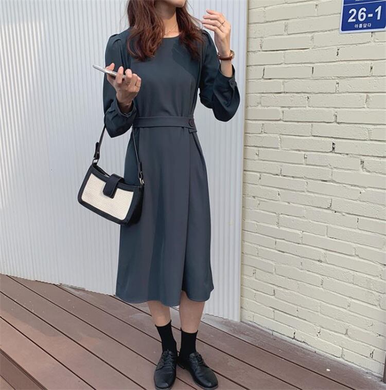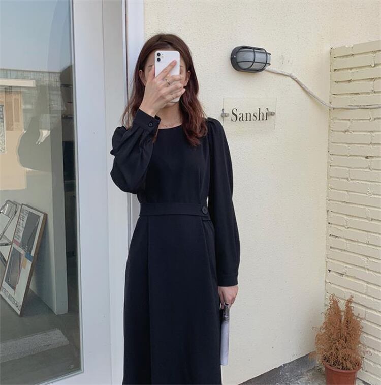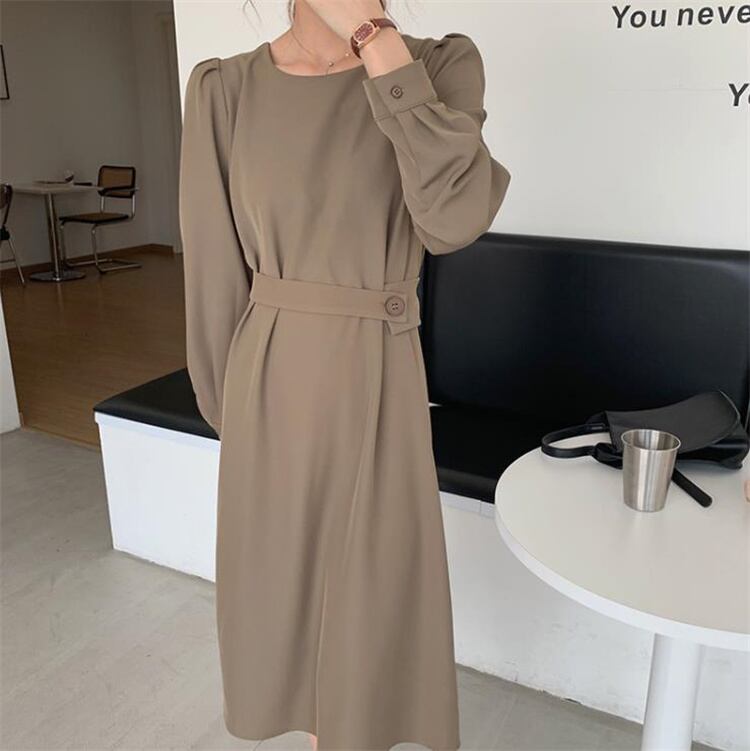 ◎【送料無料】ロングスカート ワンピース 気質 ラウンドネック サイドボタン 受け取って腰