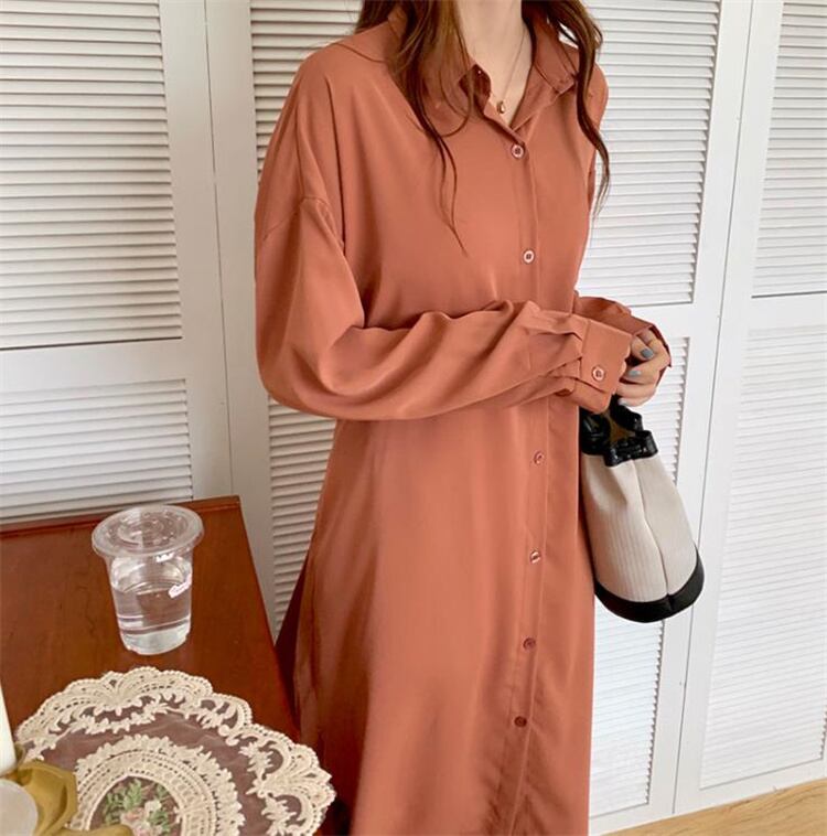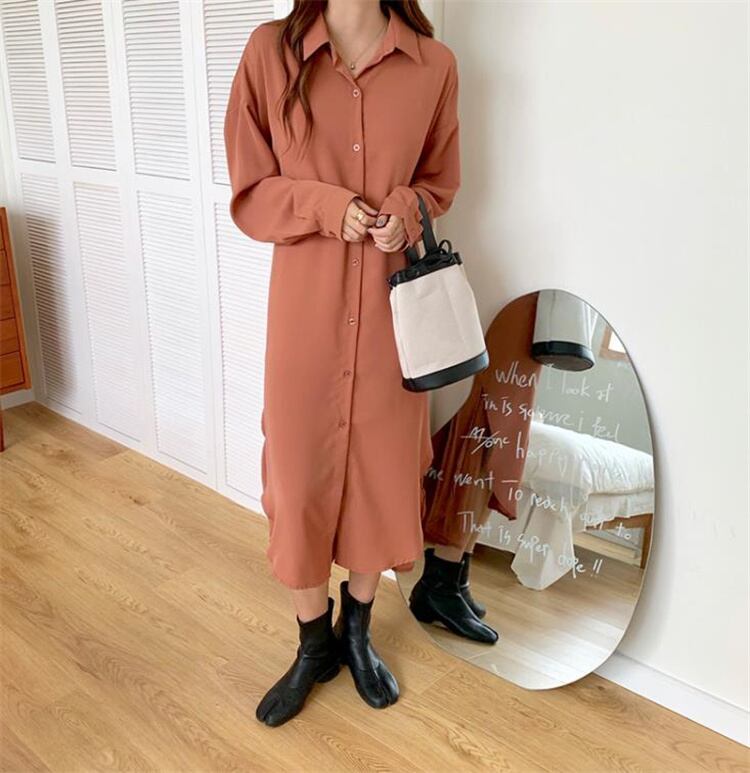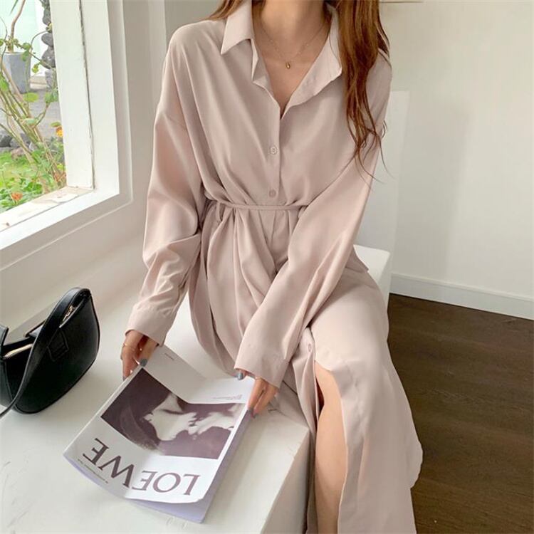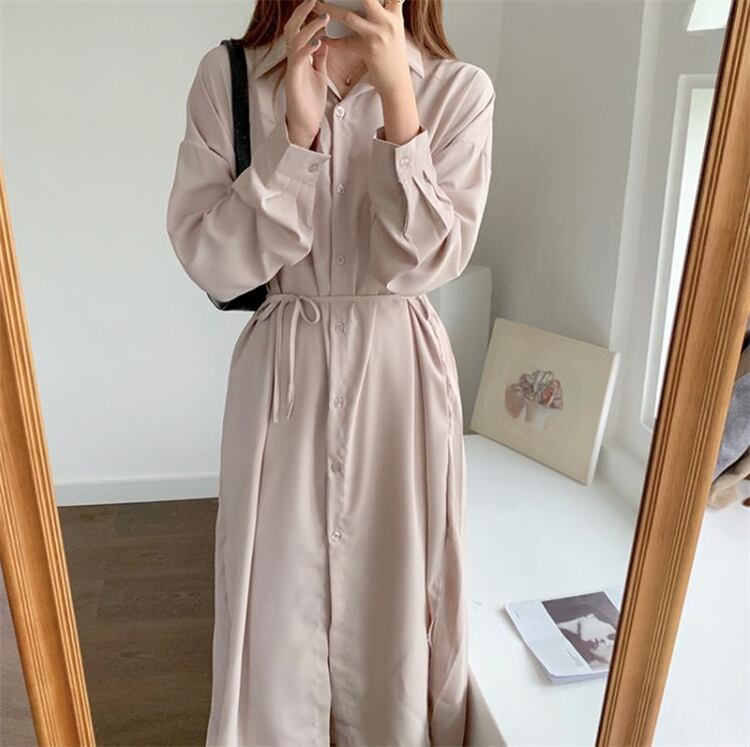 ◎【送料無料】レースアップ カジュアル スリム ロングスカート シンプル 長袖 怠惰な風 シャツワンピ ワンピース