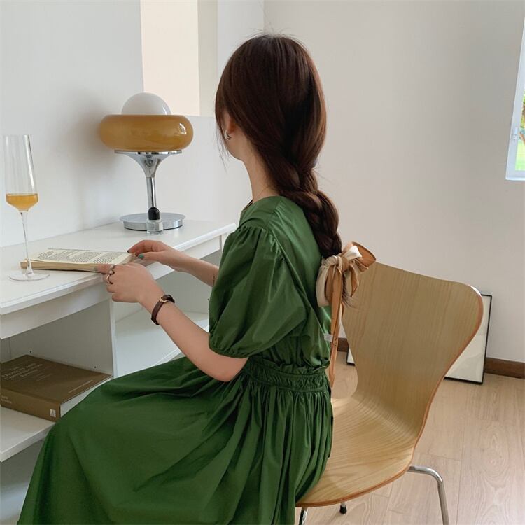 ◎【送料無料】ラウンドネック シンプル パフスリーブ デザインセンス 受け取って腰 ワンピース ロングスカート