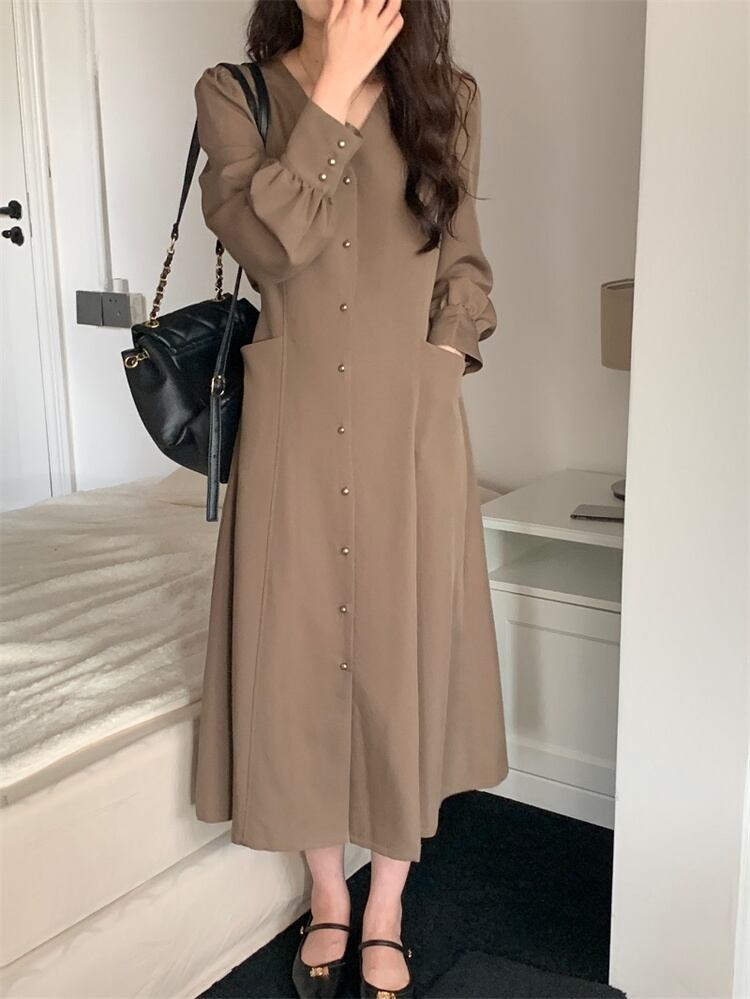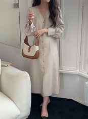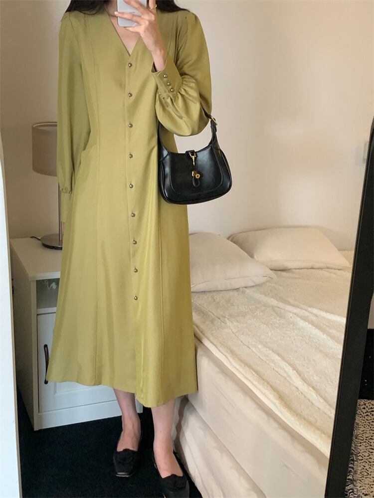 ◎【送料無料】Vネック エレガント 受け取って腰 ロングスカート スリム 単体ボタン ワンピース 中長セクション