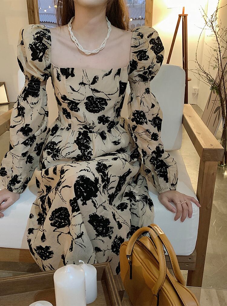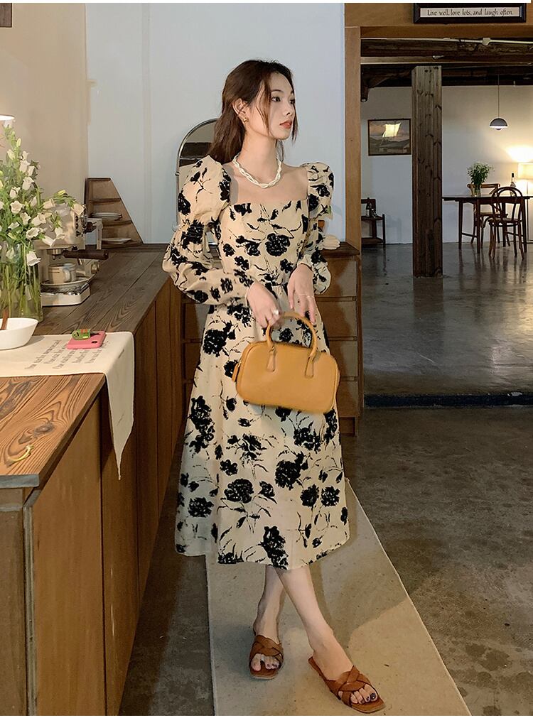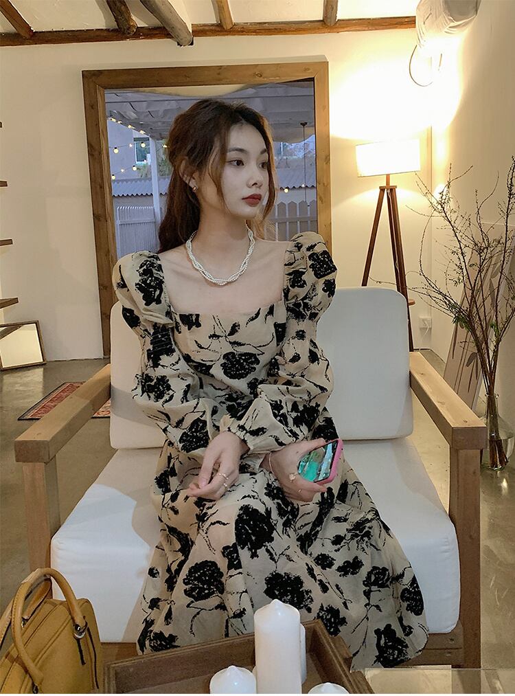 ◎【送料無料】壊れた花 2022秋 新作 気質 ロングスカート お出かけ 長袖 パフスリーブ レトロ ワンピース