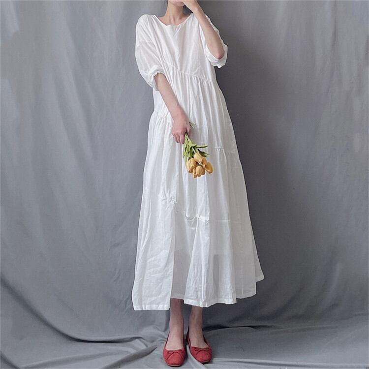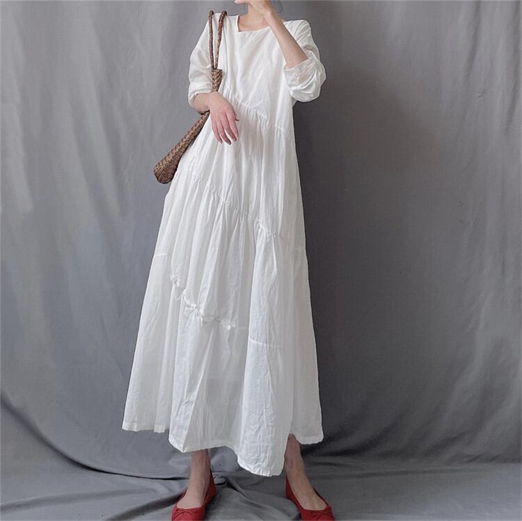 ゆったりする ロングスカート ワンピース 気質 シンプル レトロ ラウンドネック