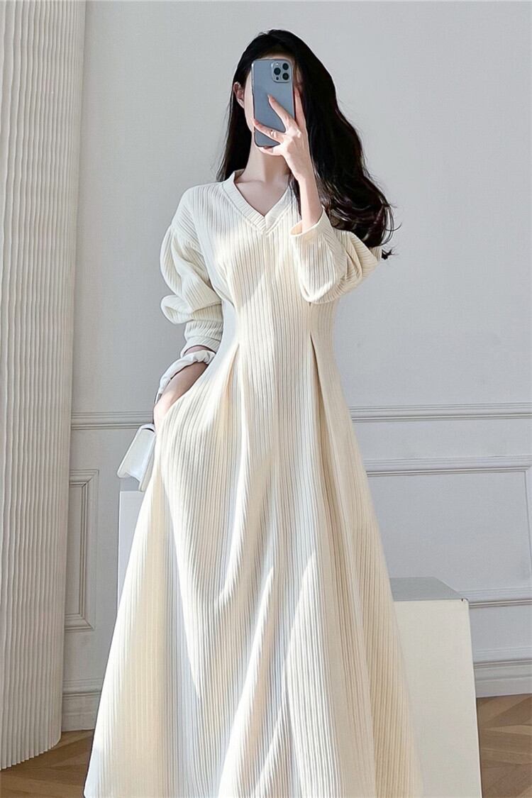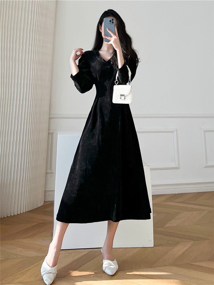 Vネック 春秋新作 受け取って腰 スリム レトロ 気質 ワンピース レディース