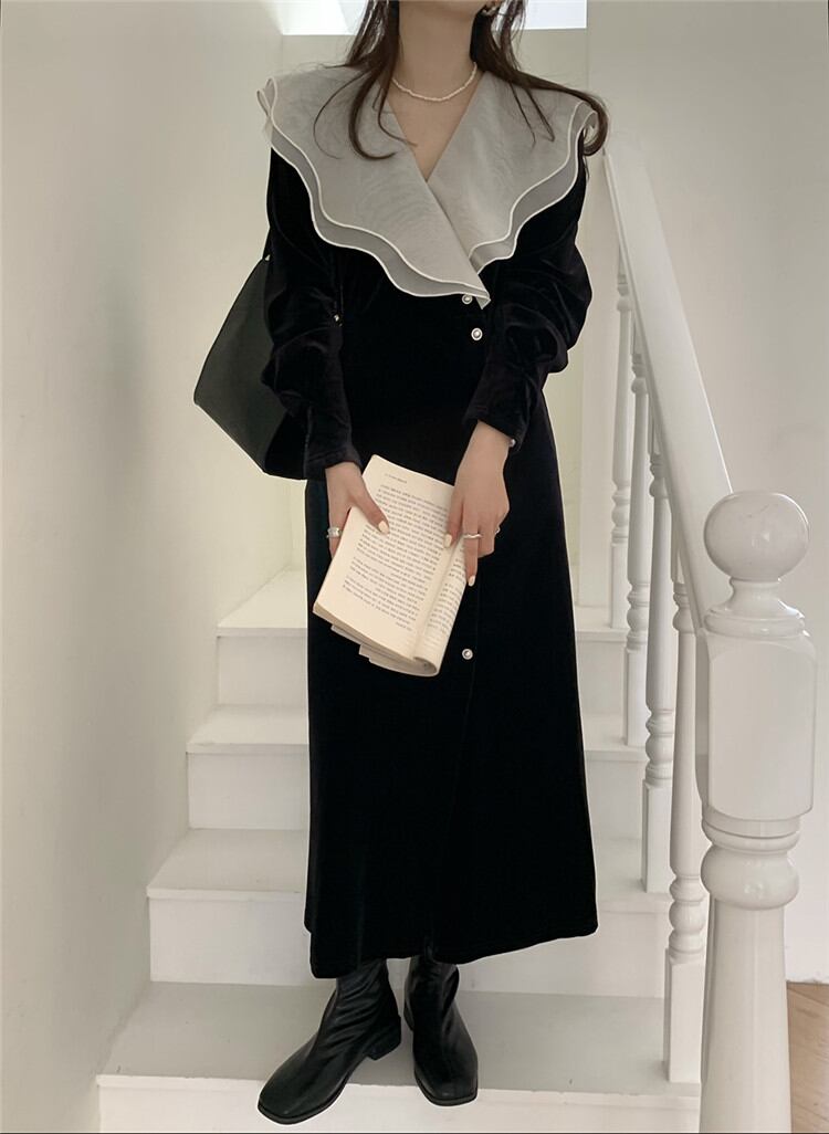 ベルベット ワンピース 個性 大人気 2022年春 レトロ 減齢 フリル Vネック