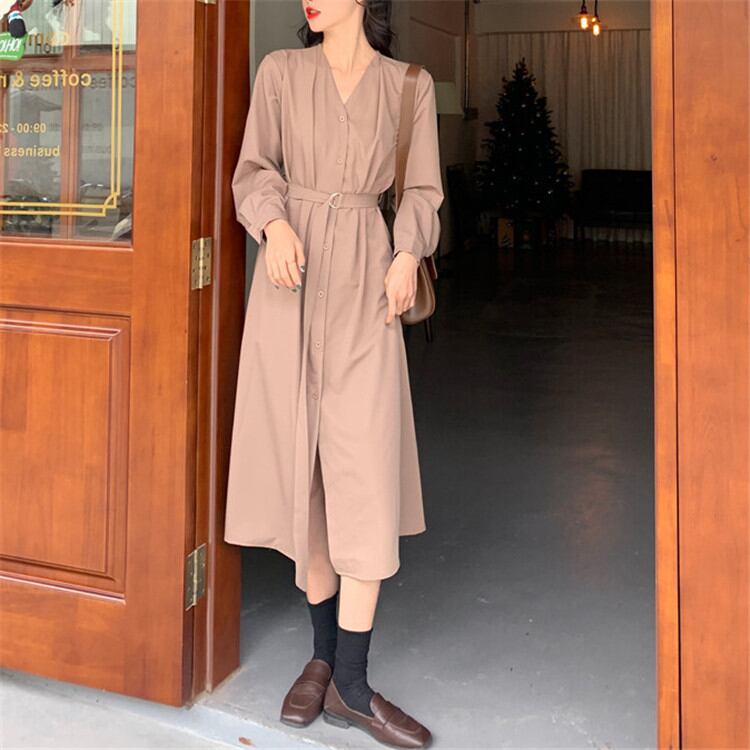 ◎【送料無料】単体ボタン ピュアカラー 長袖 ワンピース 大人気 大きいサイズ レディース Vネック