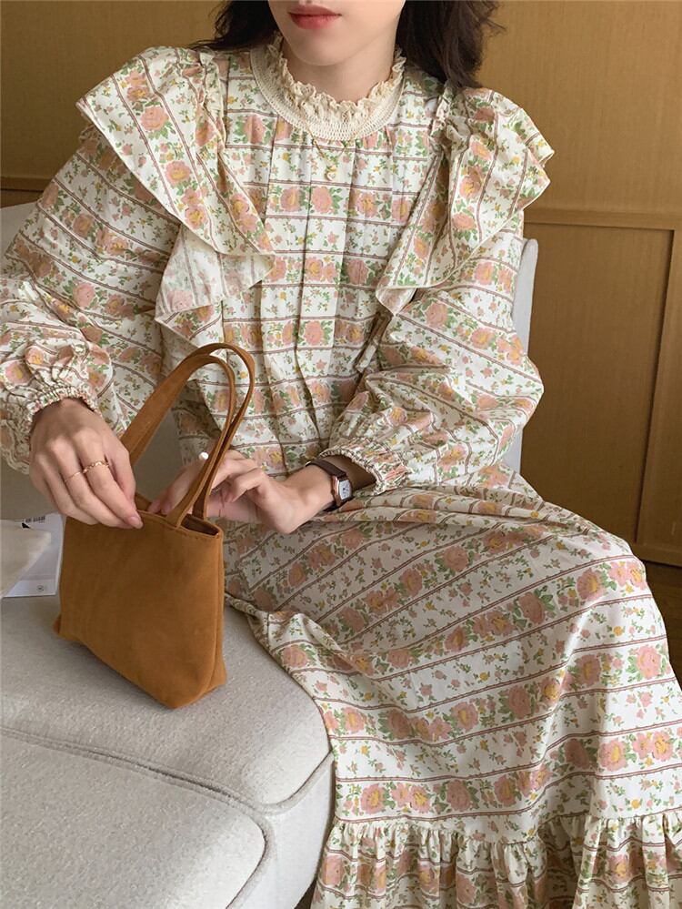 格子縞 ワンピース 長袖 スタンドカラー 中・長セクション フリル ロングスカート
