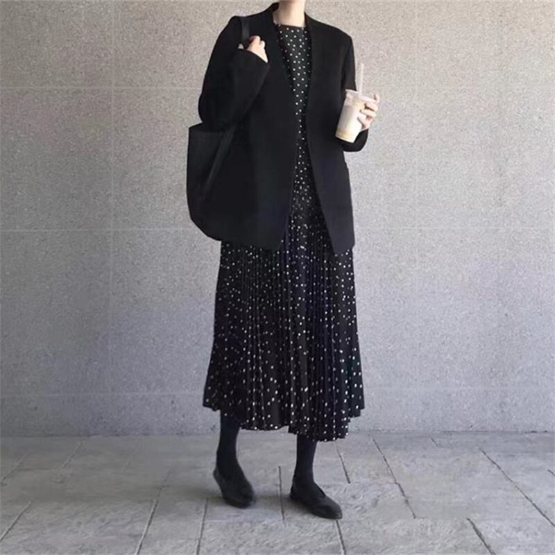 ◎【送料無料】2022春新作 水玉柄 ワンピース ロング丈ワンピ プリーツ レディース 体型カバー 着回し