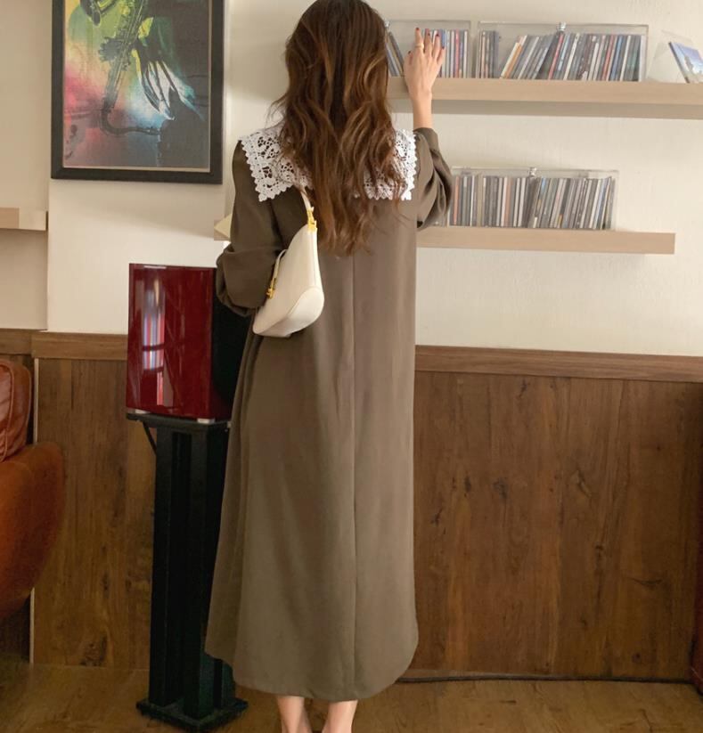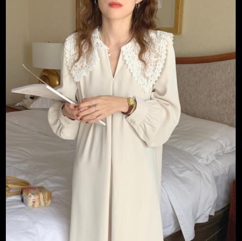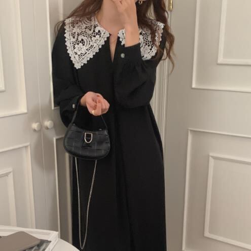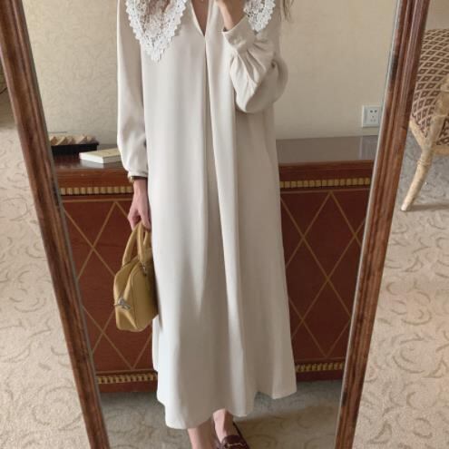 ◎【送料無料】韓国 レトロ レース かぎ針編み 縫付 プリーツ ゆったりする 膝の上 長袖 ワンビース