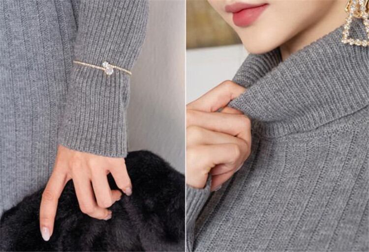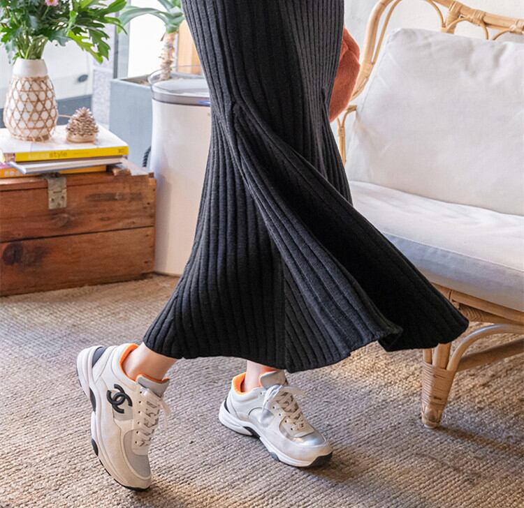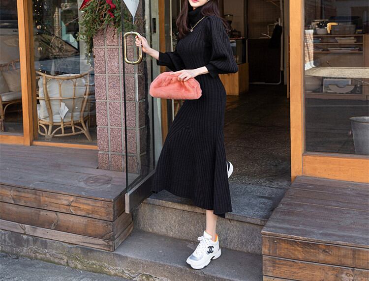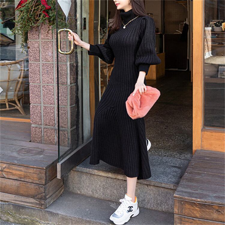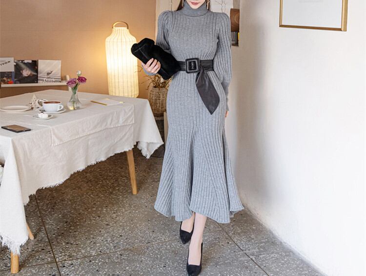 ◎【送料無料】スリム ロングスカート ニットワンピース ベルト付き タートルネック ランタンスリーブ