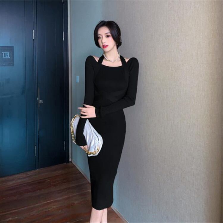◎【送料無料】レトロ 気質 ロングスカート 秋冬新作 ニットワンピース スリム 受け取って腰
