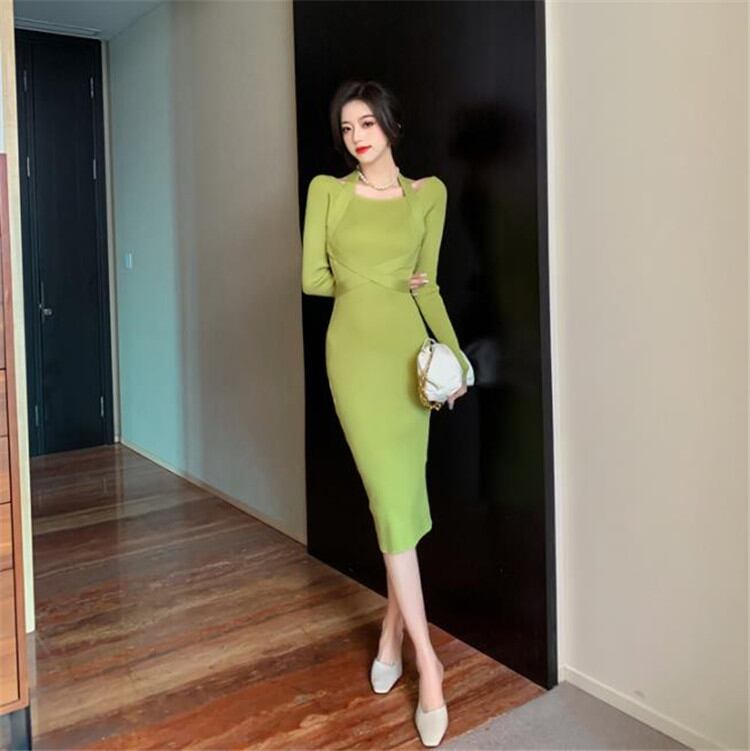 レトロ 気質 ロングスカート 秋冬新作 ニットワンピース スリム 受け取って腰