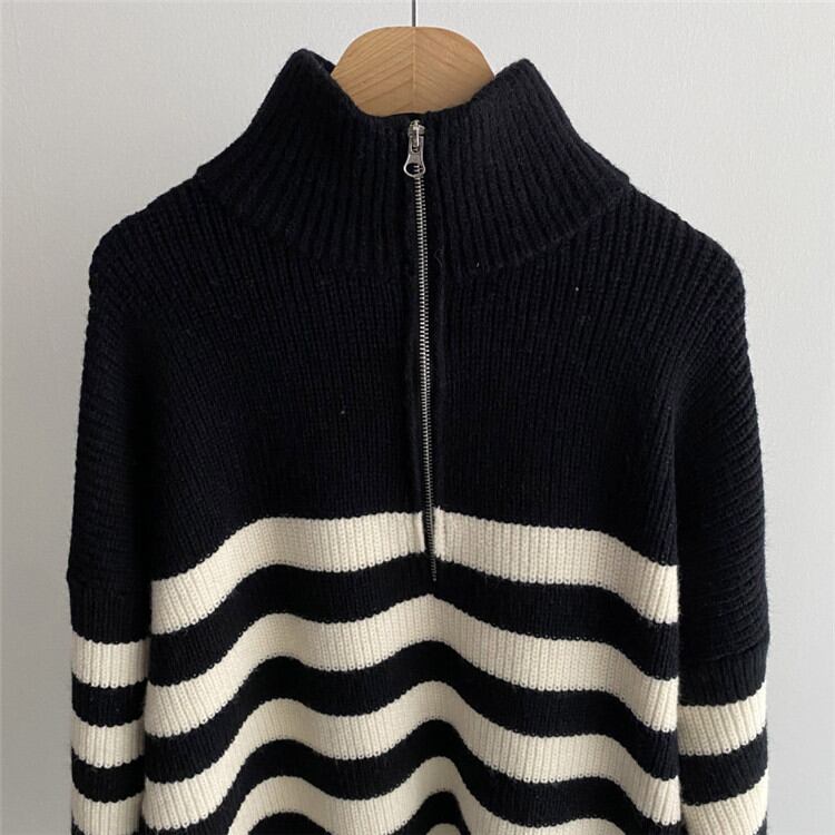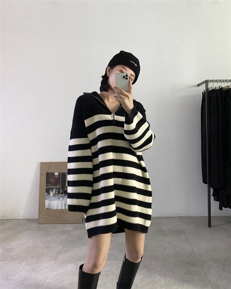 ボーダー ニット ワンピース 暖かい 厚手 中・長セクション セータースカート ゆったりする
