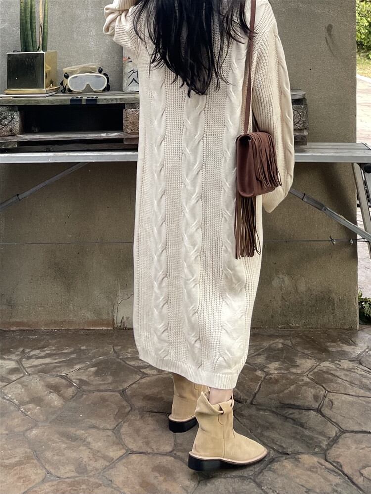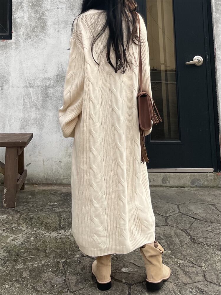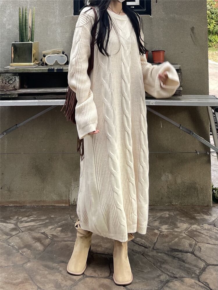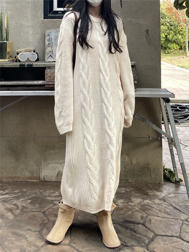 ◎【送料無料】穿いた瞬間、幸せ カジュアル ピュアカラー 長袖 麻の花 ニットワンピース ロングスカート ゆったりする