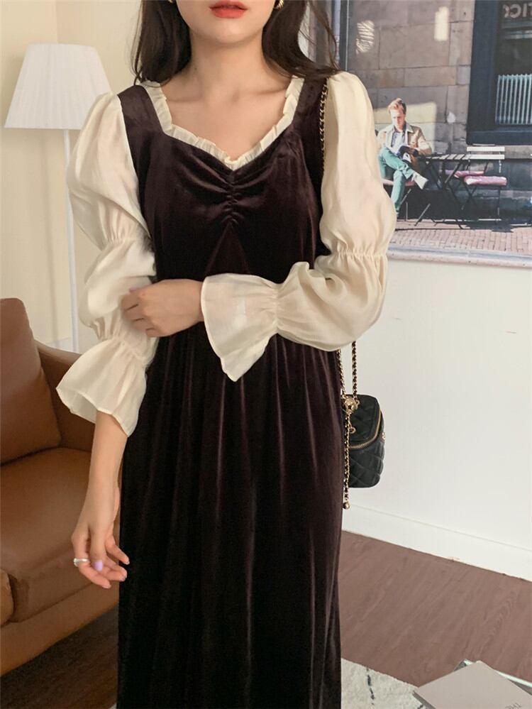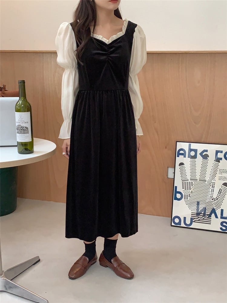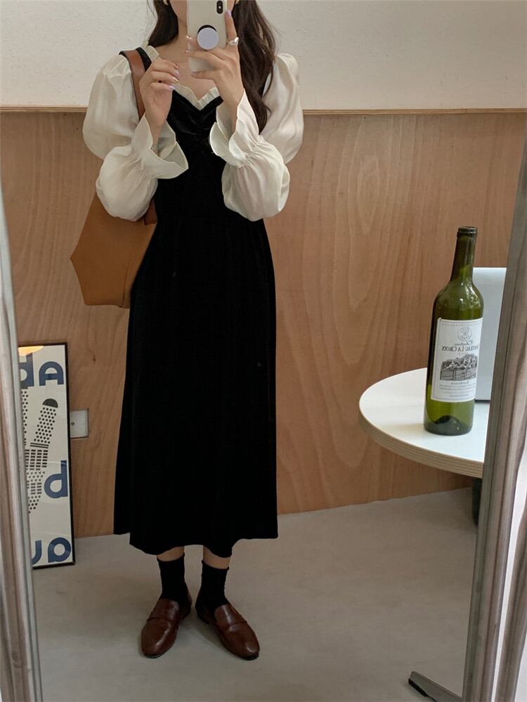 縫付 パフスリーブ ブラック ベルベット 原宿BF風 ロングセクション ワンピース 2色