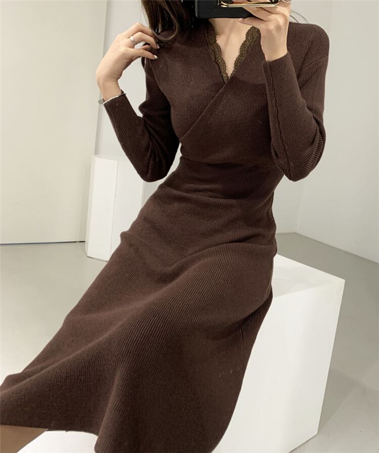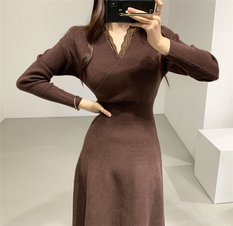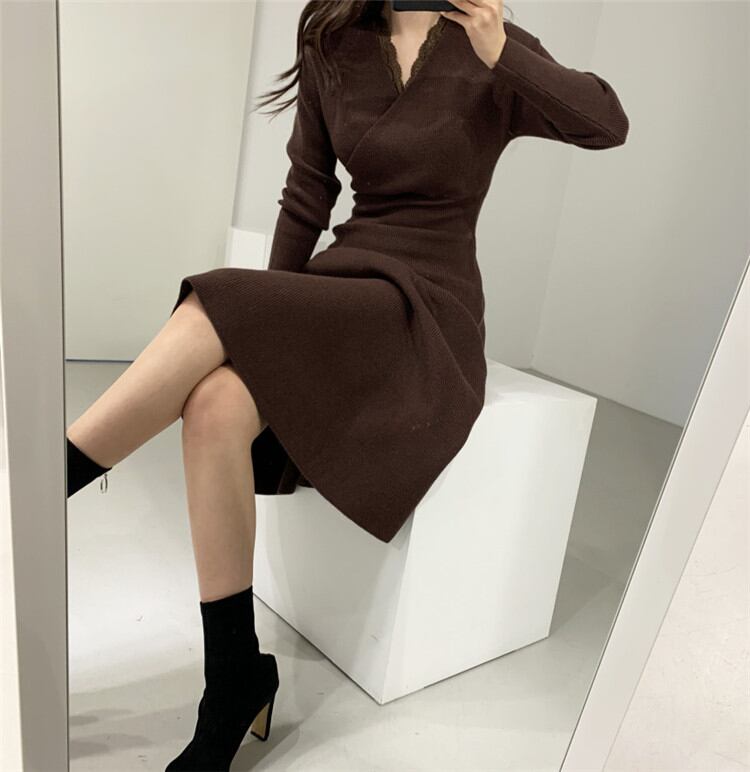 ◎【送料無料】おしゃれに体型カバーが叶う 気質 Vネック 中・長セクション 受け取って腰 長袖 ニット ワンピース